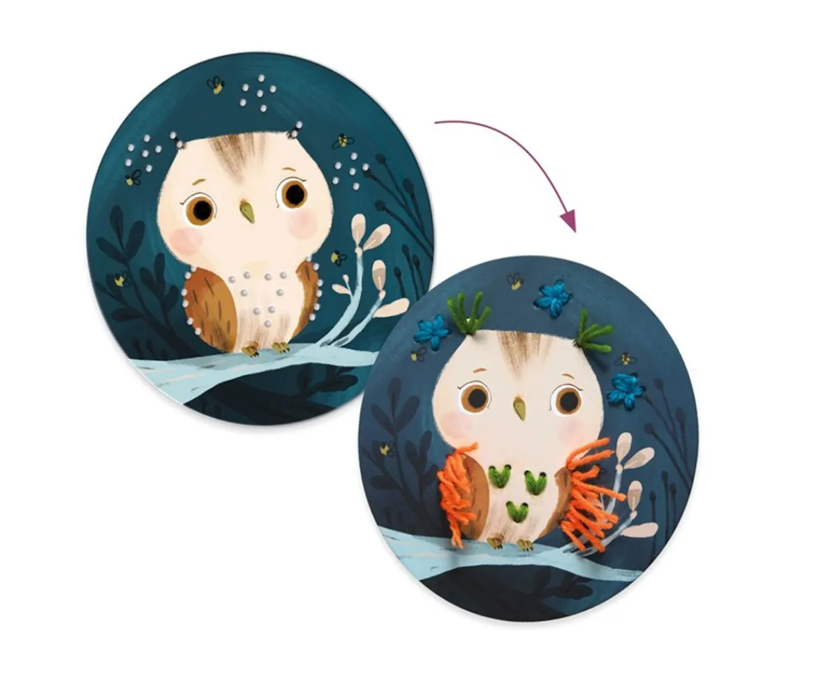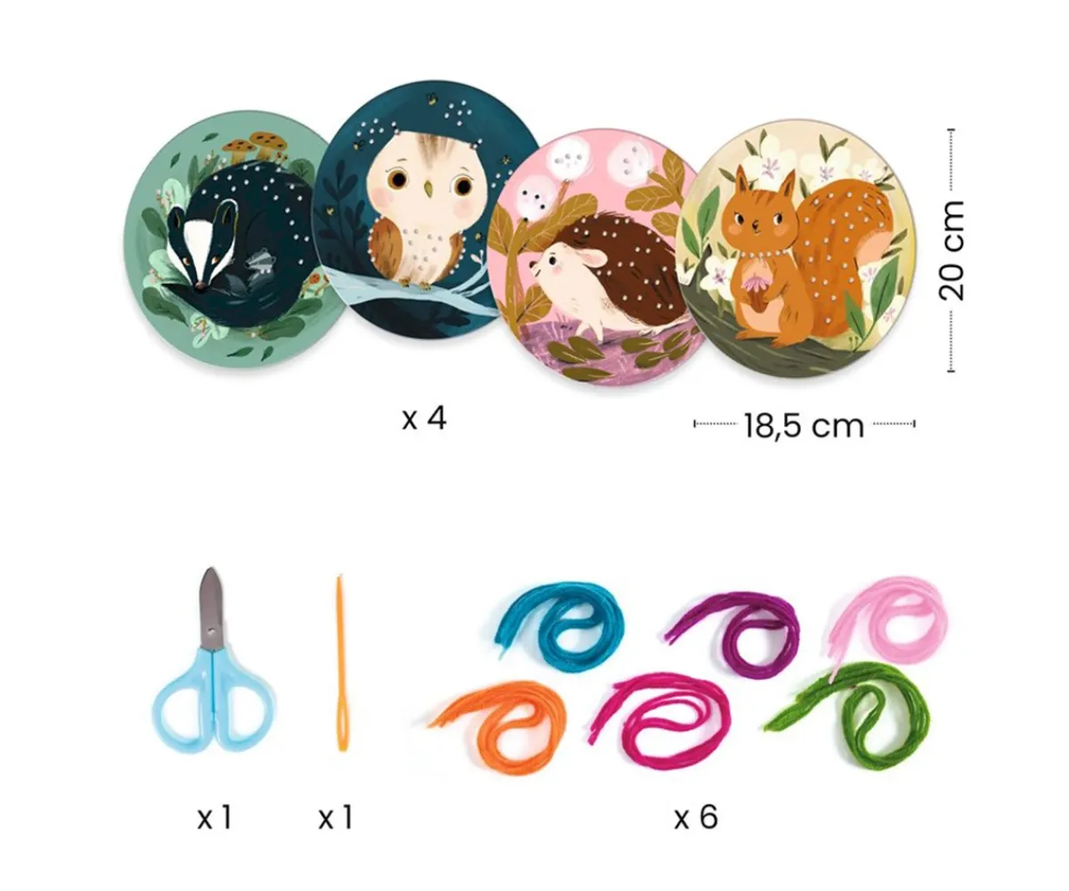Set de manualidades Djeco para enhebrar la lana en las 4 fichas con bonitas ilustraciones de animales del bosque. Una actividad creativa y divertida donde los peques aprenderán conocimientos de bordado.