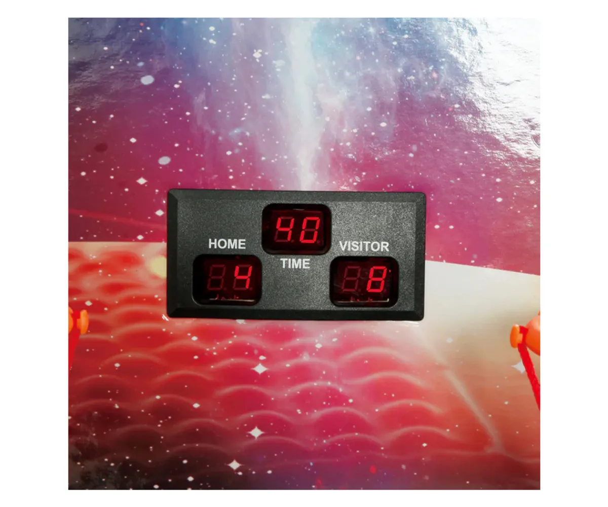 Ideal para salas de juegos, sótanos o espacios recreativos, este arcade electrónico permite que dos jugadores se enfrenten mientras un marcador electrónico de doble pantalla mantiene la cuenta de quién va ganando.