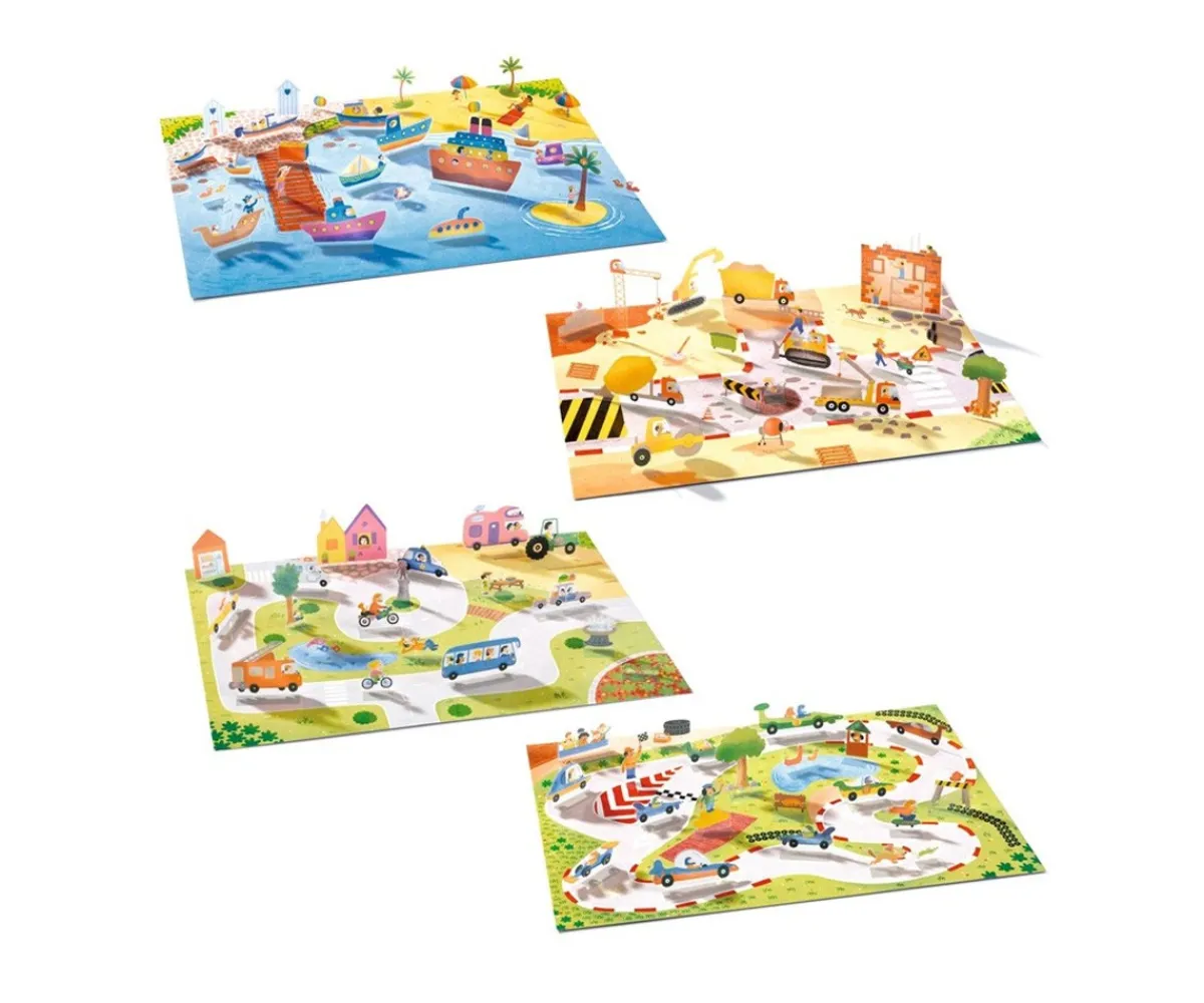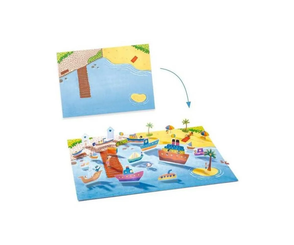 El juego consiste en colocar las pegatinas sobre distintas escenas y luego levantarlas para formar composiciones en 3D, lo que añade una dimensión extra al juego tradicional con adhesivos. Como las pegatinas son reposicionables, los peques podrán crear y recrear tantas veces como quieran.