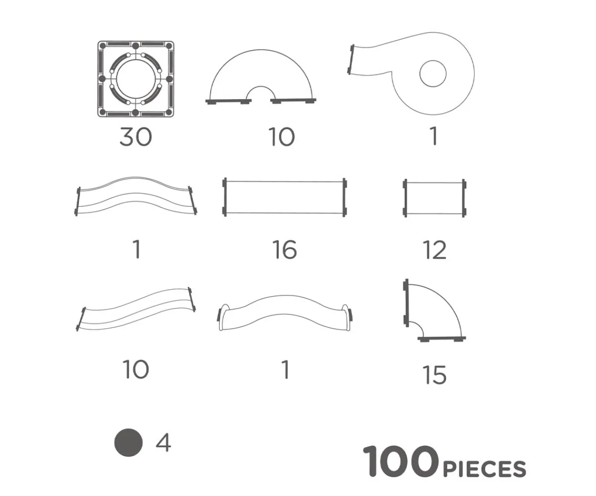 - Incluye 100 piezas (16 tubos largos y rectos,15 esquinas, 12 olas,10 tubos en U, 30 cuadrados abiertos, 4 bolas luminosas, 1 tazón)