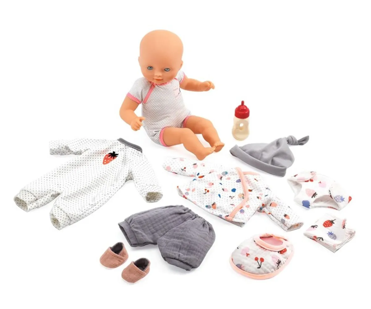 Baby Vanille está preparado en su bonita maleta con un precioso pijama y gorro, un pañal, su biberón y su babero para que no le falte nada en vuestro viaje. Los peques estarán encantados de llevar a cualquier lugar a su muñeco preferido.