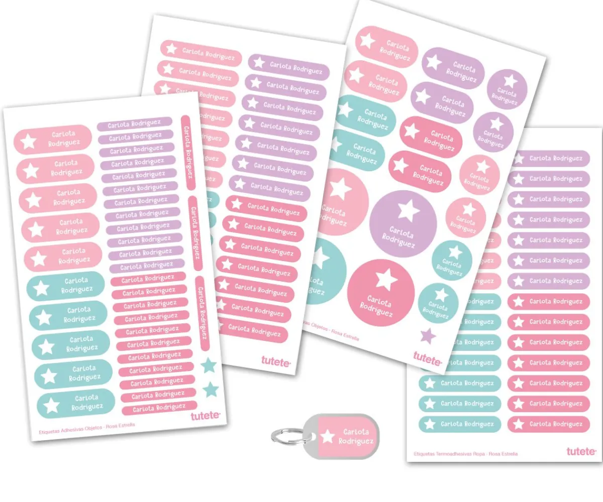 Tutete trae este pack súper práctico formado por un Sello Personalizado Gran Estrella con el nombre de tu peque y el pack Combinado Termo y Pegatinas Rosa Estrella.