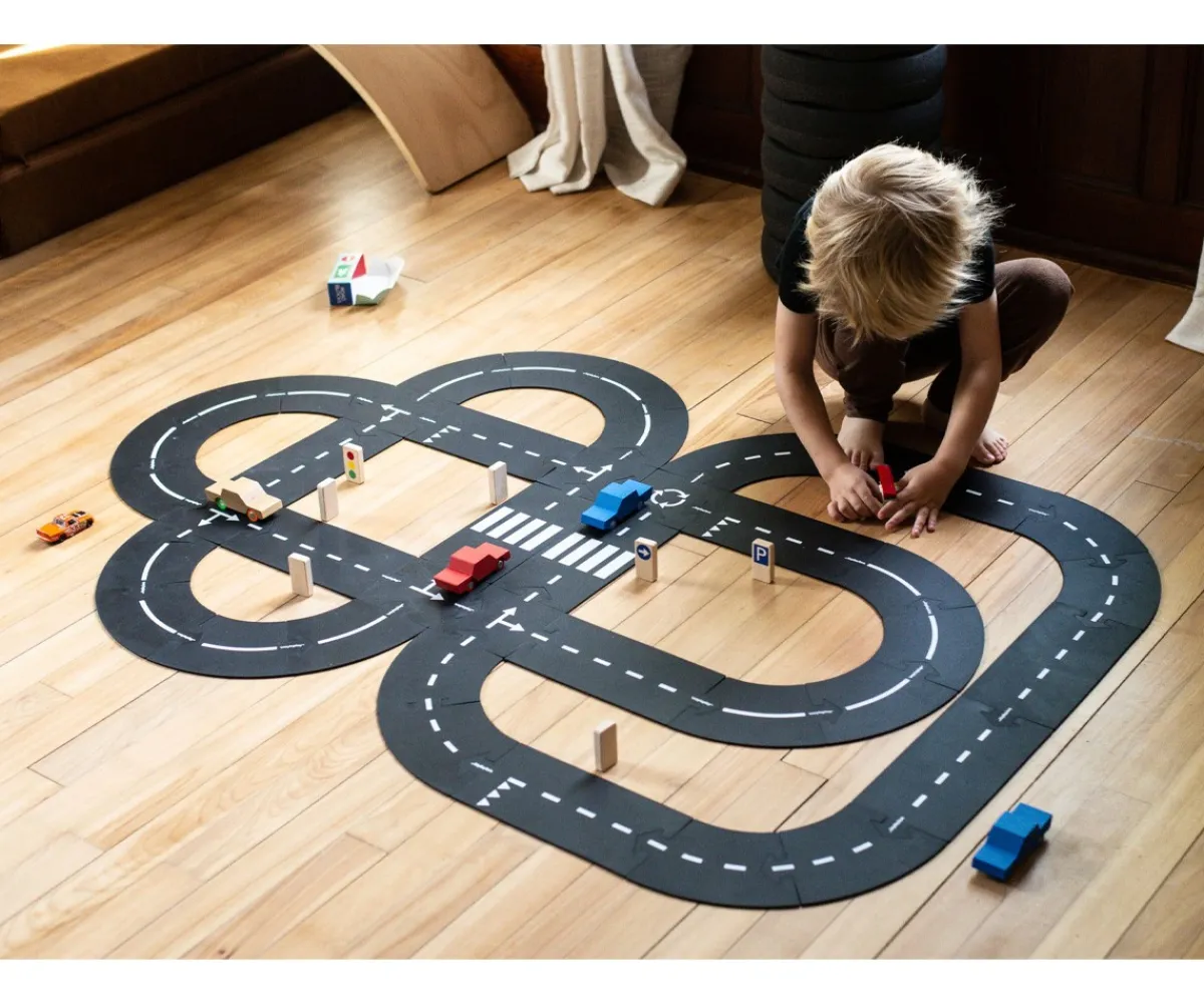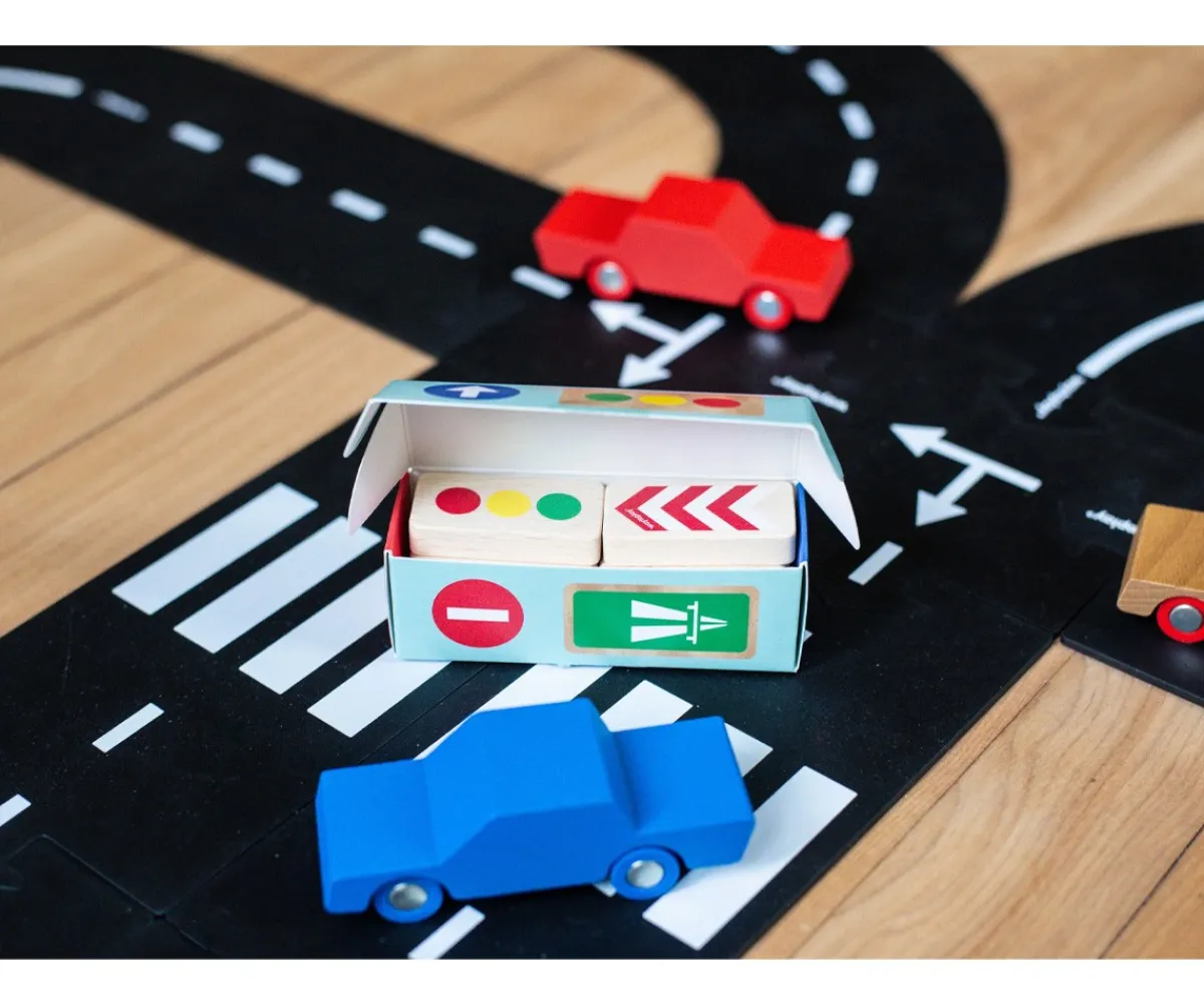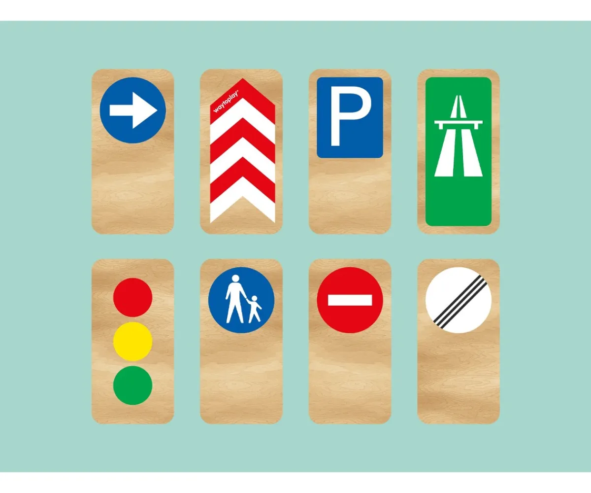El set de Waytoplay incluye 8 señales de tráfico de madera diseñadas especialmente para complementar los circuitos de carreteras flexibles de la marca que puedes encontrar