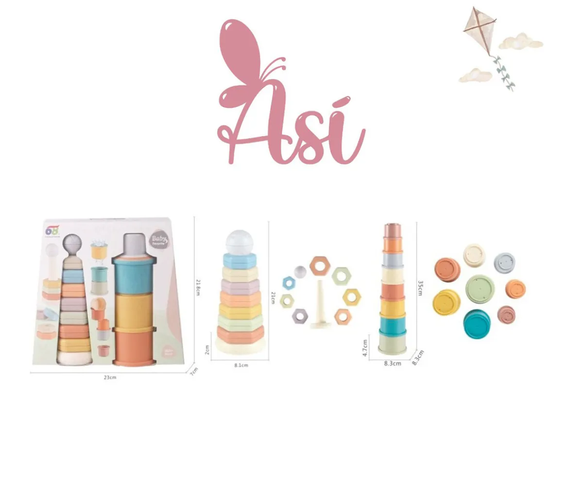 Un set para apilar una y otra vez dos torres con piezas de distintos tamaños que fomentarán el desarrollo de las habilidades motoras de tu peque y la coordinación, al tiempo que lo pasan en grande colocando una y otra vez las piezas de estos apilables.