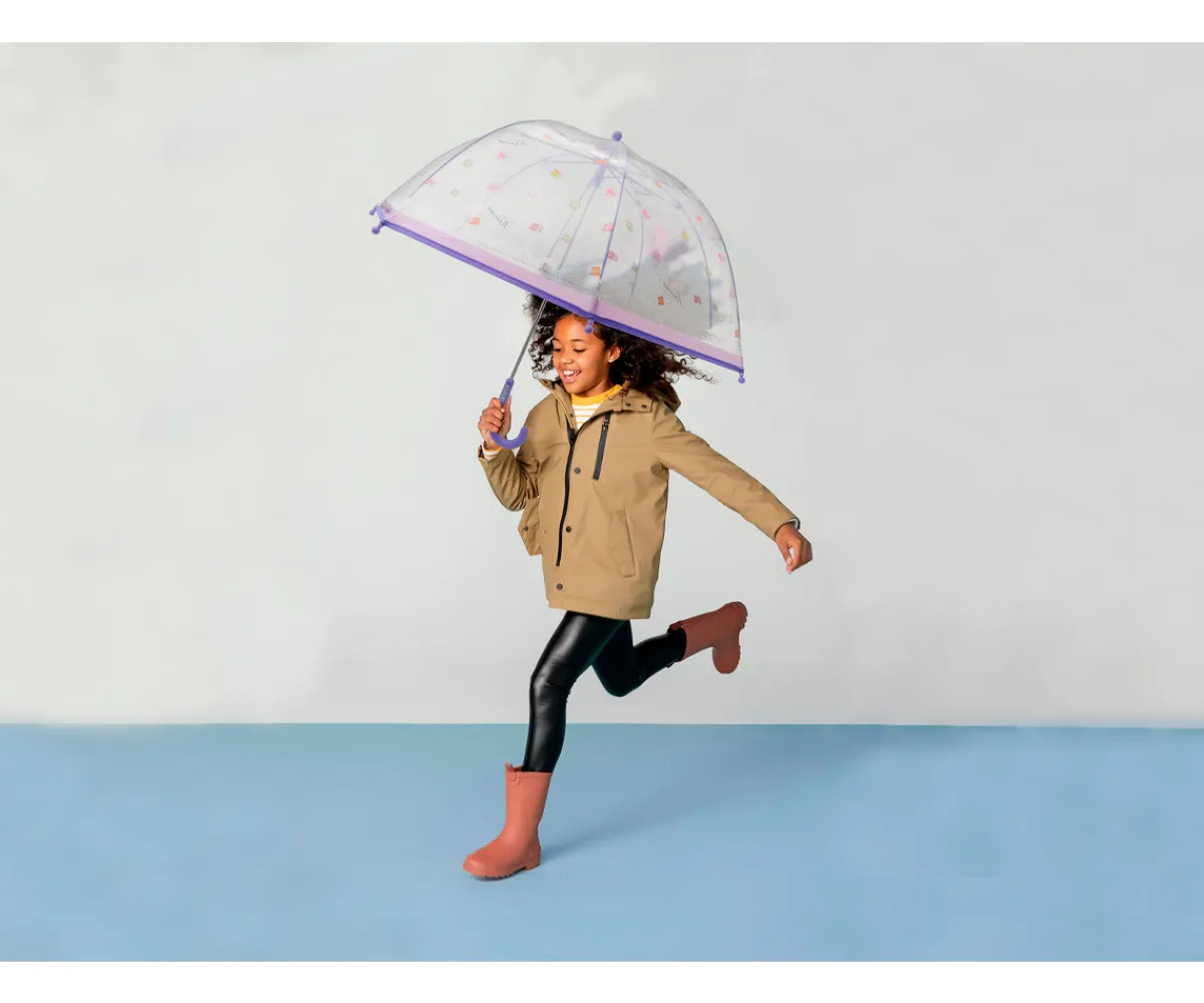 Su apertura manual y segura está pensada especialmente para manos pequeñas: mecanismo suave, resistencia adecuada y materiales duraderos. El acabado transparente permite ver a través del paraguas, aportando comodidad y seguridad durante los paseos.