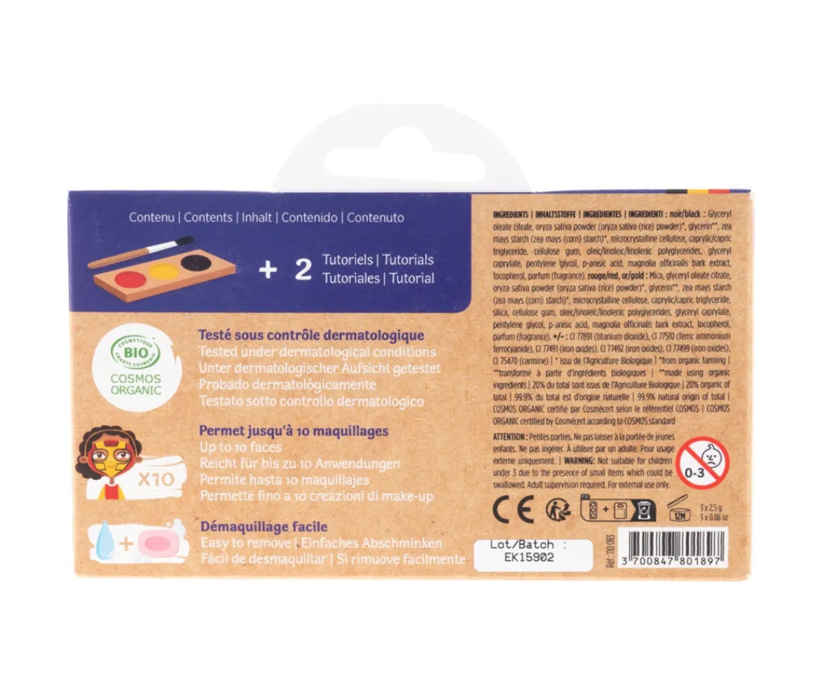 Conviértete en un ninja o superhéroe con este kit de maquillaje hipoalergénico y orgánico certificado, al agua, que contiene una paleta de 3 colores.