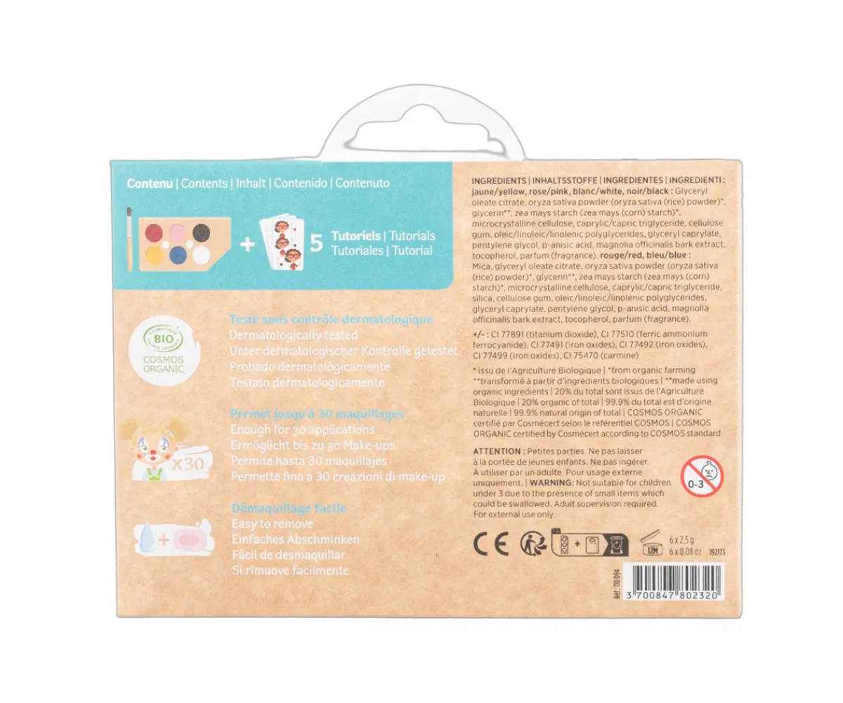 El maquillaje se usa con agua y se aplica sobre la piel con el pincel. El desmaquillado se realiza fácilmente con agua tibia y un poco de jabón. Después de su uso, deje el pincel y la paleta de sombras que se sequen antes de guardarlos en la caja.