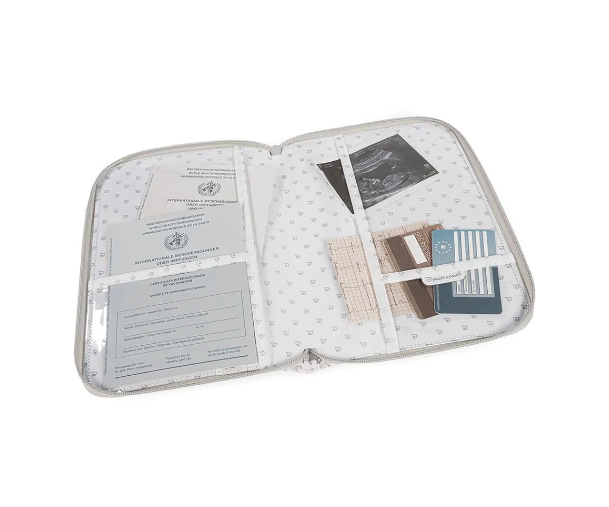 Cuenta con un práctico cierre de cremallera para así guardar seguro el libro de nacimiento y todos los documentos de tu bebé