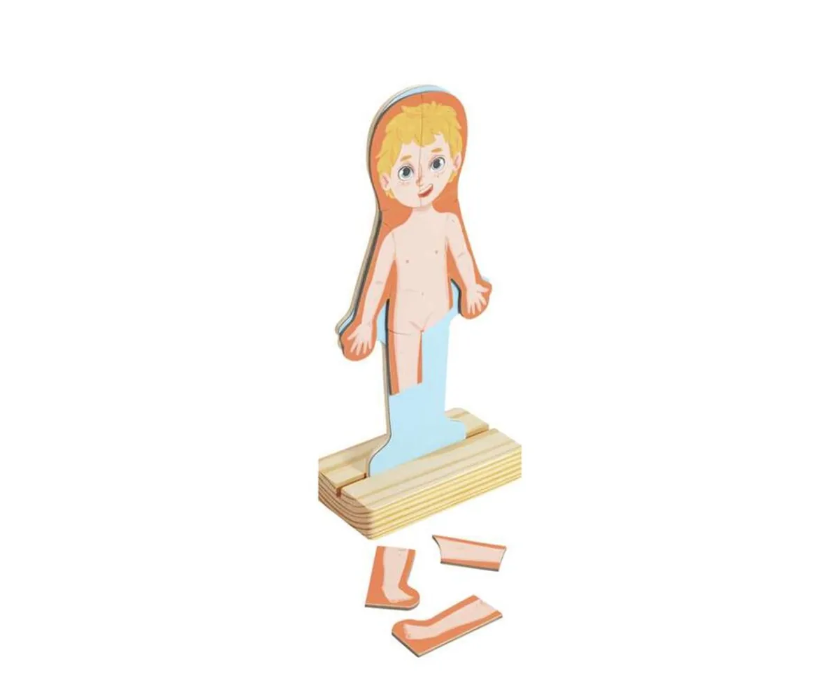 - Incluye 63 piezas, una base de pie de madera, un contorno del cuerpo con imanes del cuerpo de niño y niña, un esqueleto, un aparato circulatorio, un aparato muscular, un sistema nervioso con órganos y 6 tarjetas de doble cara del cuerpo humano