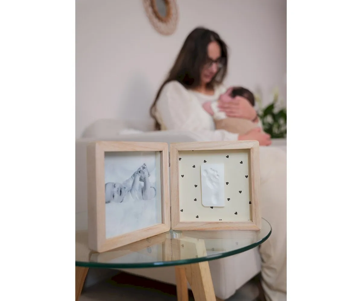 Un marco de madera con 2 paneles que mostrará un recuerdo precioso de tu bebé. En uno de los paneles podrás colocar una foto de tu bebé y en el otro panel su huella.