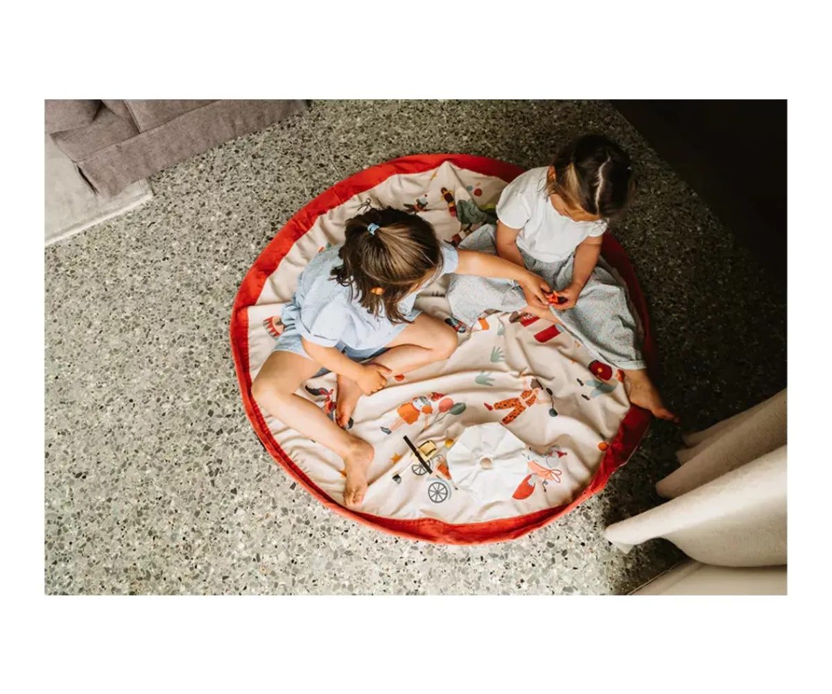 Este saco se desdobla y se convierte en una manta de juegos donde el niño puede jugar con todas sus juguetes, grandes y pequeños, y cuando llega la hora de acostarse, sólo hay que cerrarla y ya está todo recogido.