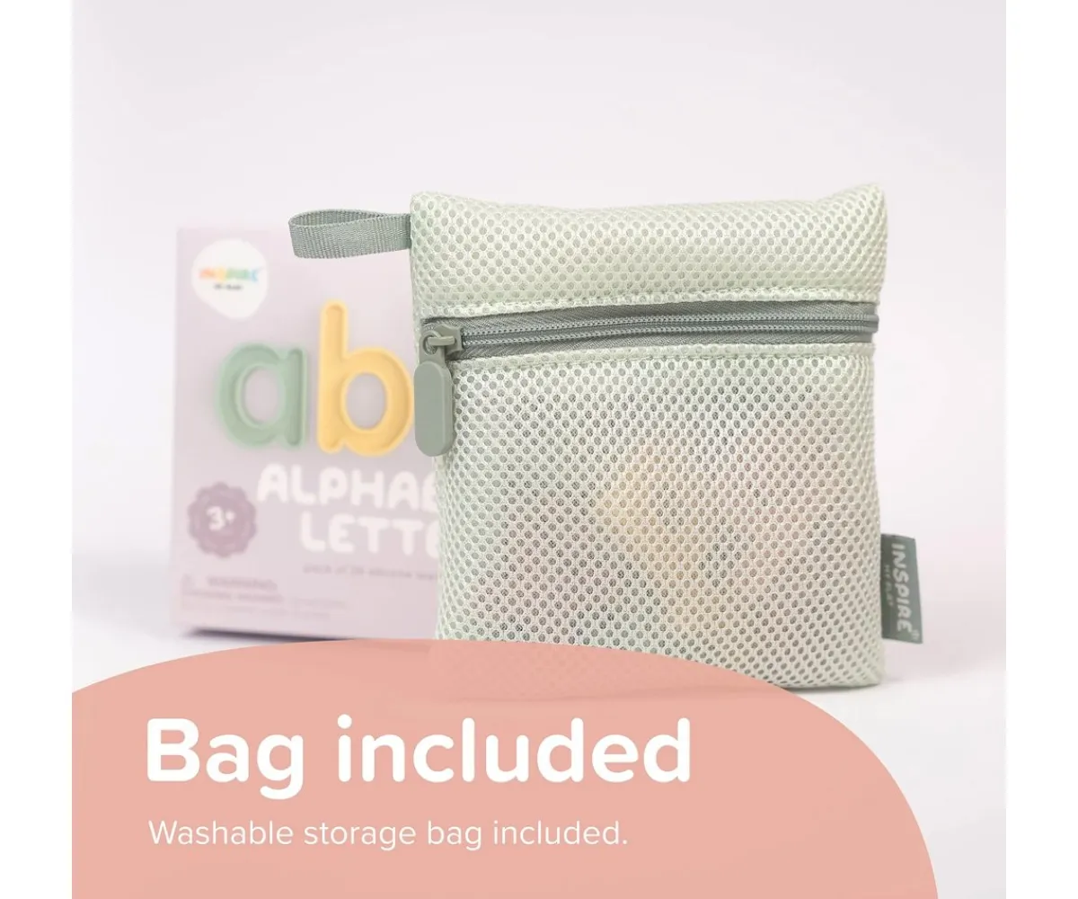 El set de letras de Inspire My Play consta de 26 letras de silicona con perfil empotrado almacenadas en una bolsa con cierre de cremallera que podrás lavar fácilmente.