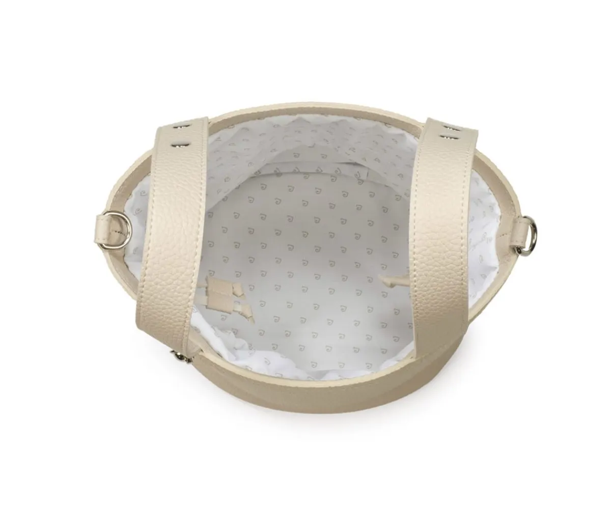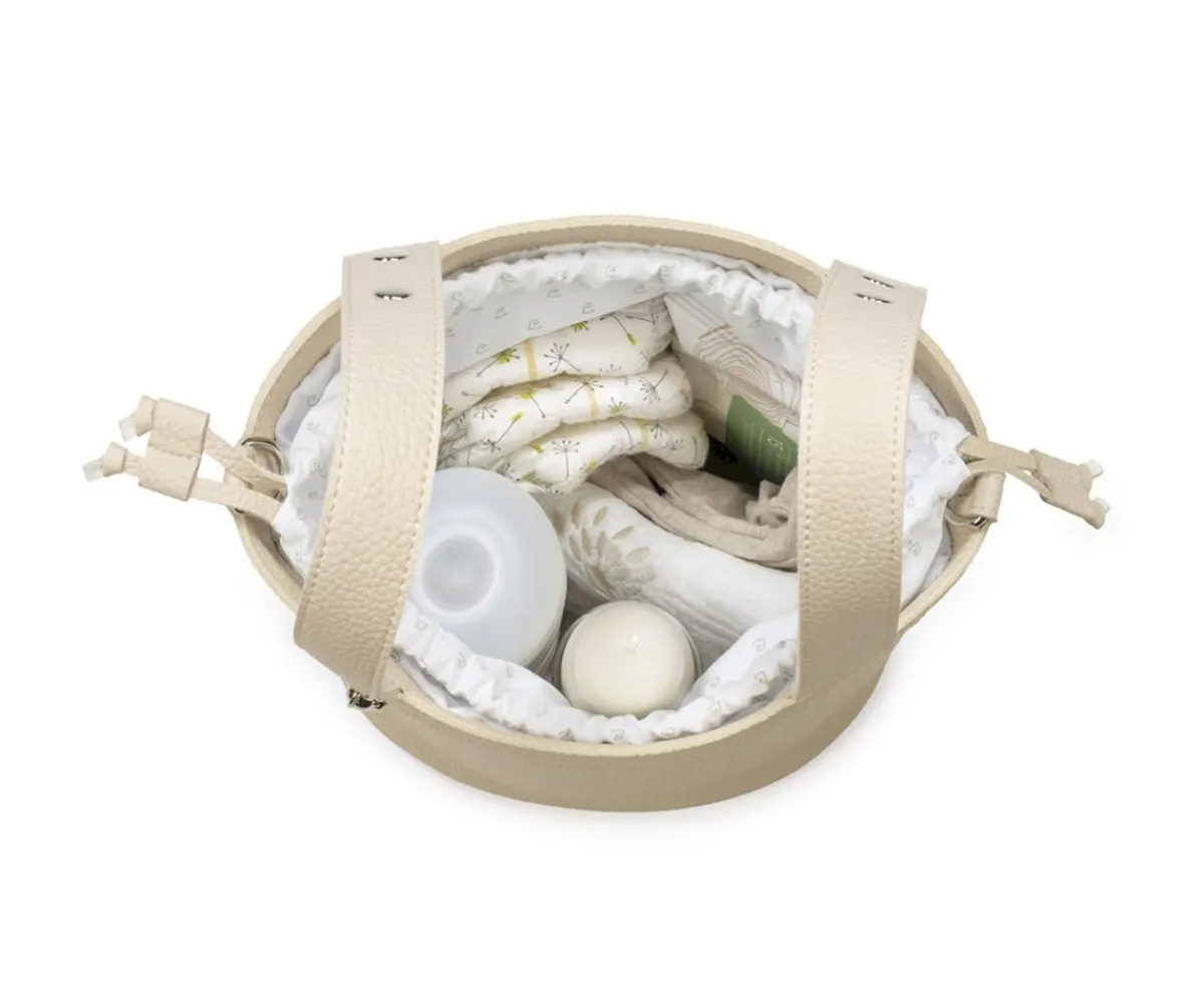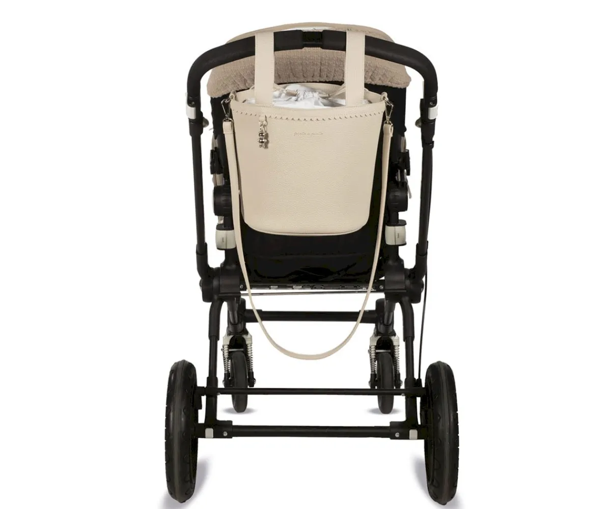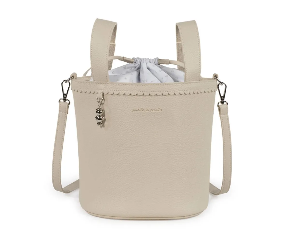 El bolso pequeño en forma de cubo Icon Cream de Pasito a Pasito es ideal para llevar todo lo necesario durante el paseo del bebé, sujeto en el carrito ó colgado como un bolso convencional. Su resistente y delicada polipiel lo hace ligero y duradero, con amplio espacio en su interior y cierre mediante cordones para no perder nada.
