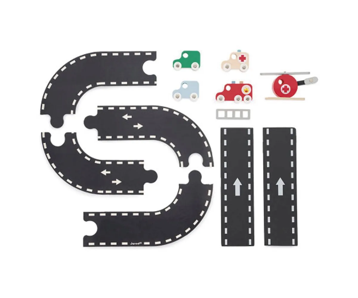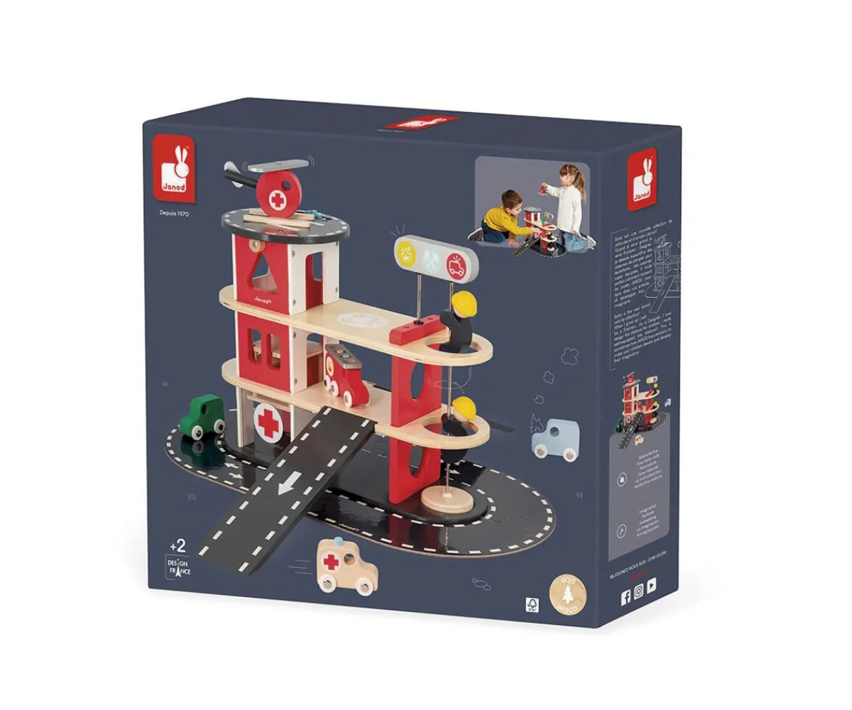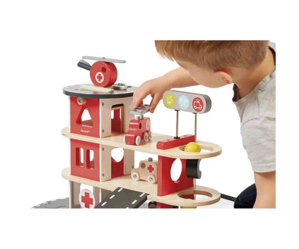 - Incluye: 2 coches, 1 ambulancia, 1 camión de bomberos, 1 helicóptero,un ascensor mecánico, 2 bomberos no extraíbles