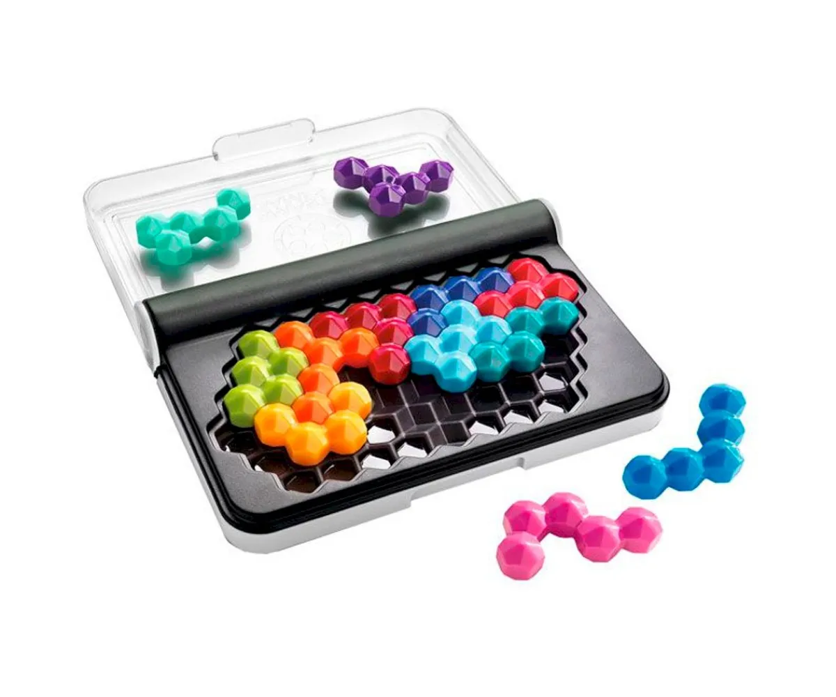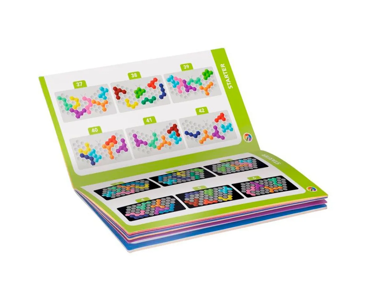 La parte superior del tablero incluye una superficie para los desafíos en 2D y para los desafíos piramidales en 3D y la base del tablero se convierte en una plataforma para diseñar mariposas 2D. Todo en el mismo estuche compacto y portátil.