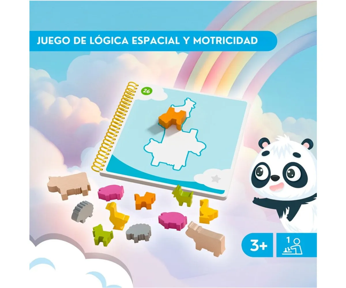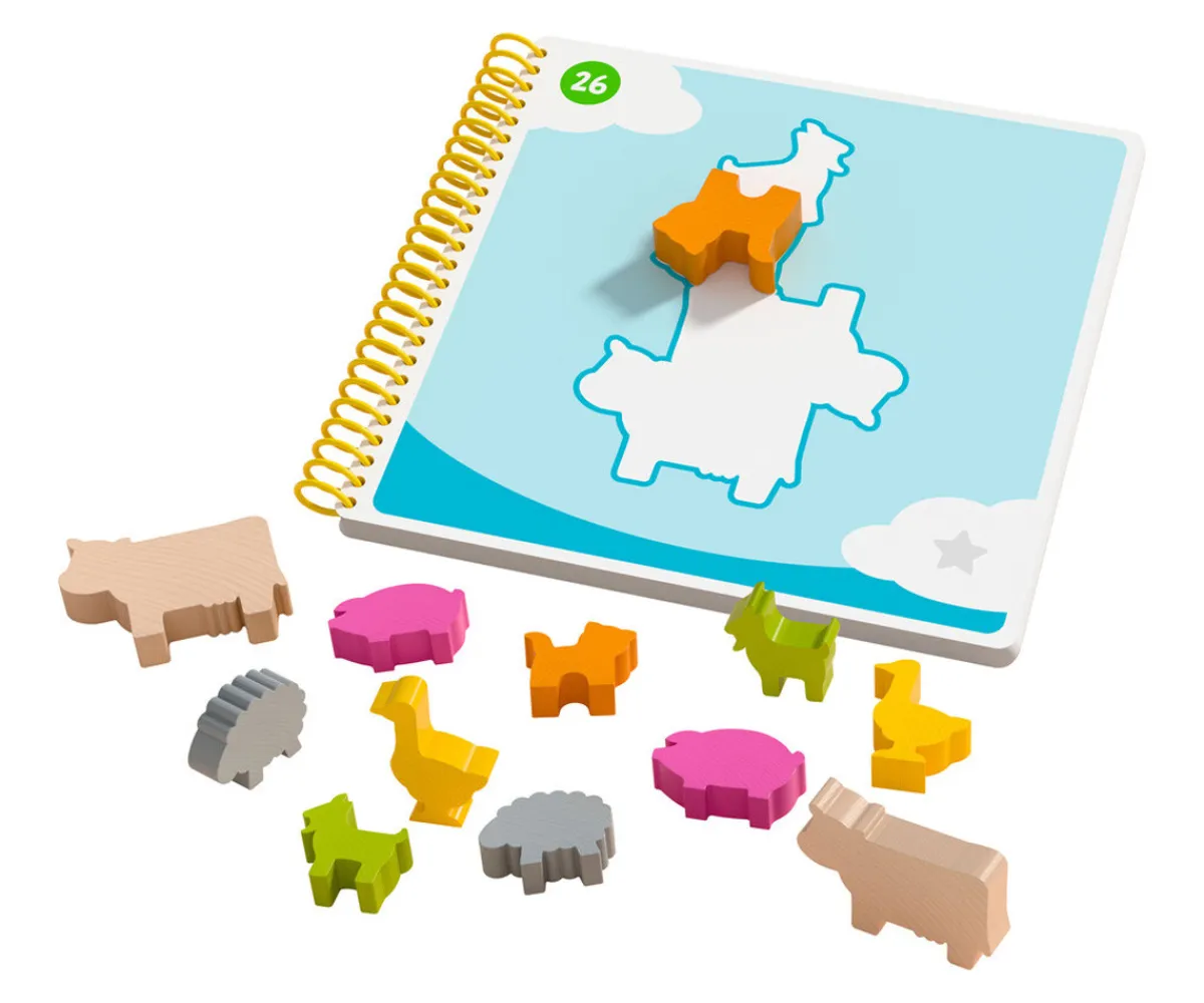 - Incluye: 12 animales de madera de colores (2 vacas, 2 cerdos, 2 ovejas, 2 cabras, 2 gansos, 2 gatos), 1 cuaderno de anillas grande con 60 retos de puzzles (incluye hojas con pegatinas), 1 cuaderno de anillas pequeño con las correspondientes soluciones (y lo mismo con los retos de apilado), 1 instrucciones del juego