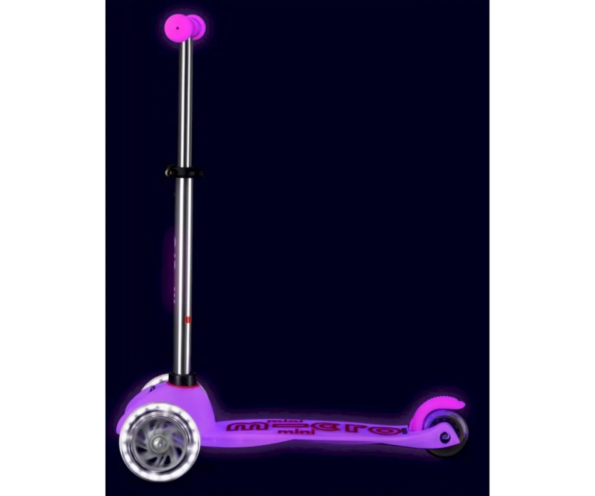 Este bonito patinete Glow color rosa de Micro está fabricado en polipropileno y sus componentes de color brillan en la oscuridad.