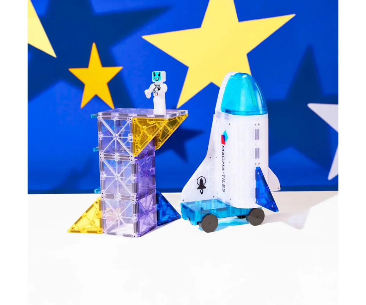 - Incluye: 1 transbordador espacial, 1 cápsula espacial, 1 ventana de cápsula, 1 figura espacial, 1 chasis con ruedas, 1 rectángulo grande, 6 cuadrados microMAGS, 8 triángulos rectángulos, 12 cuadrados