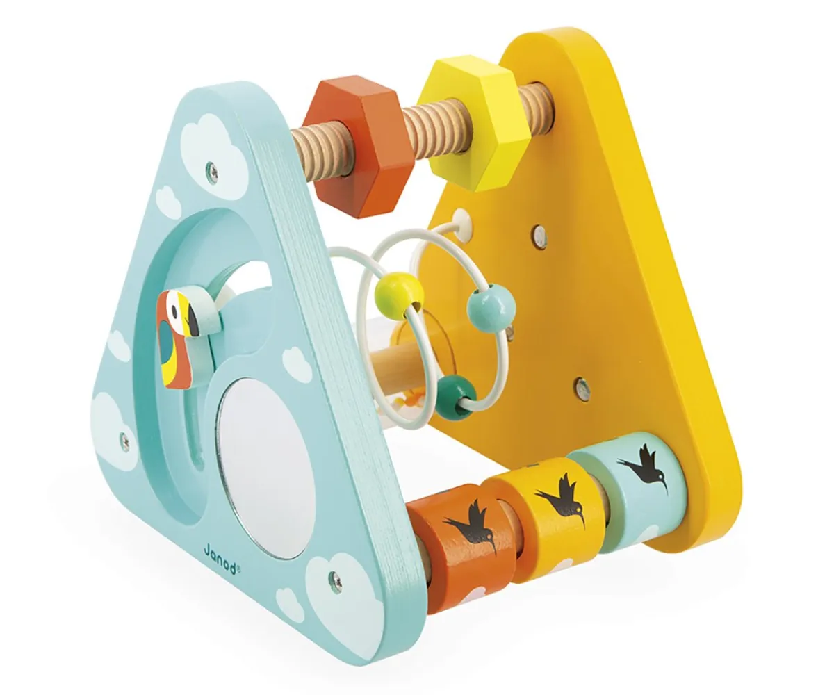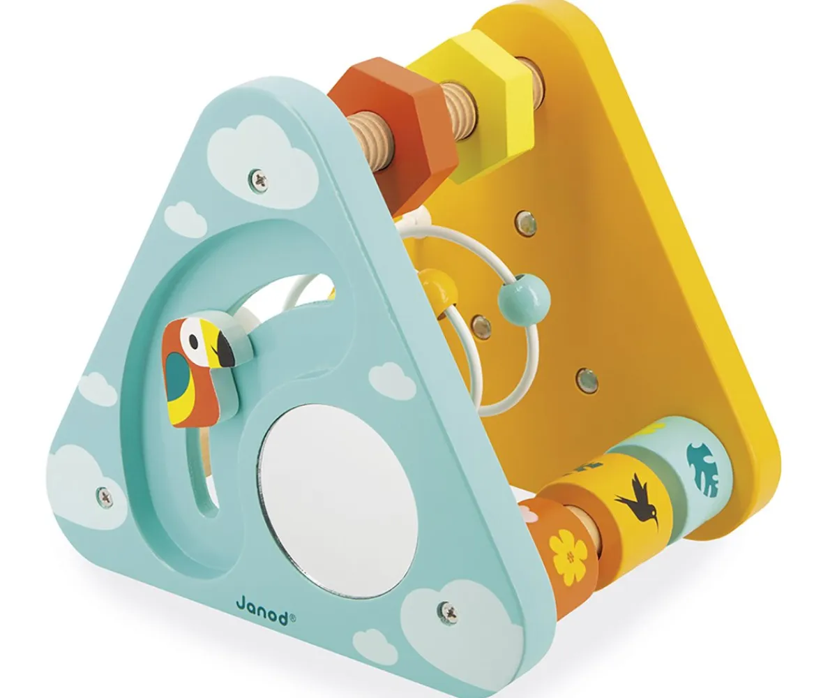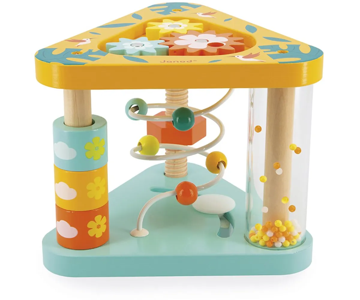 Este juguete de madera es un estímulo que promete muchos descubrimientos al bebé. Con 7 actividades: laberinto, espejo, engranajes para girar, tuercas para atornillar, ábaco, palo de lluvia y cilindros para alinear es ideal para niños de a partir de 12 meses. Con su tamaño compacto, este juguete completo es fácil de llevar a todas partes y de ser manipulado por el niño. ¡Los pequeños de a partir de 1 año podrán desarrollar la motricidad fina y la coordinación, así como familiarizarse con los colores y las formas! ¡Con multitud de actividades a cada lado, el bebé no parará de descubrir cosas nuevas! Este juguete de estímulo está pintado al agua y está hecho de madera de bosques gestionados de manera sostenible, con certificado FSC®.
