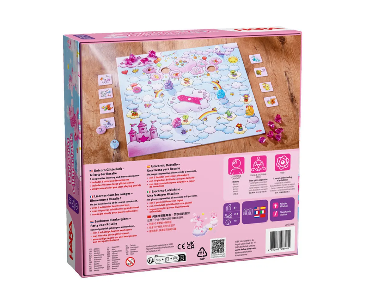 En Unicornio Destello Una fiesta para Rosalie, los pequeños jugadores se embarcan en una aventura mágica a través de las nubes de colores. Su misión es recolectar las 8 fichas de amigos y los cristales brillantes antes de que la pequeña unicornio Rosalie llegue a la nube donde se celebra la gran fiesta.