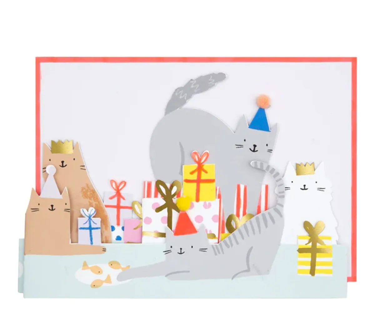 Felicita el cumpleaños de la forma más original con esta tarjeta de Meri Meri decorada con gatitos con sombreros brillantes y pompones.