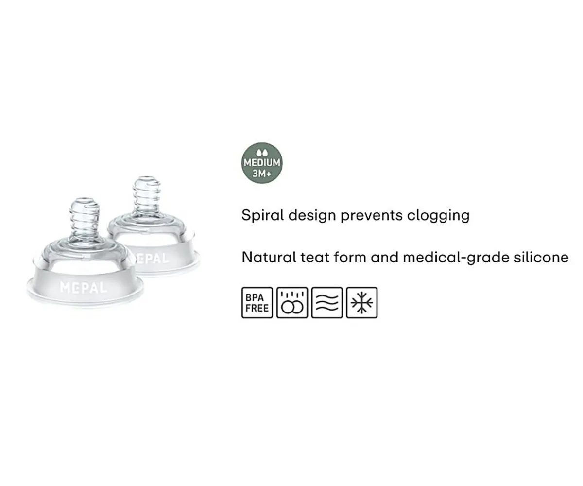 Set de 2 tetinas transparentes para los biberones Mio de Mepal. Podrás tener repuestos y así poder reutilizar el biberón. La tetina está especialmente diseñado para evitar cólicos y su tetina tiene diseño en espiral para prevenir el bloqueo.