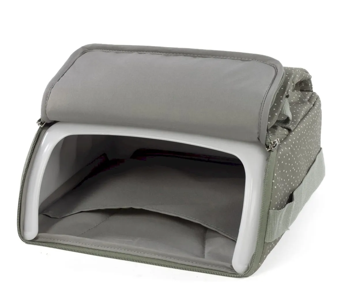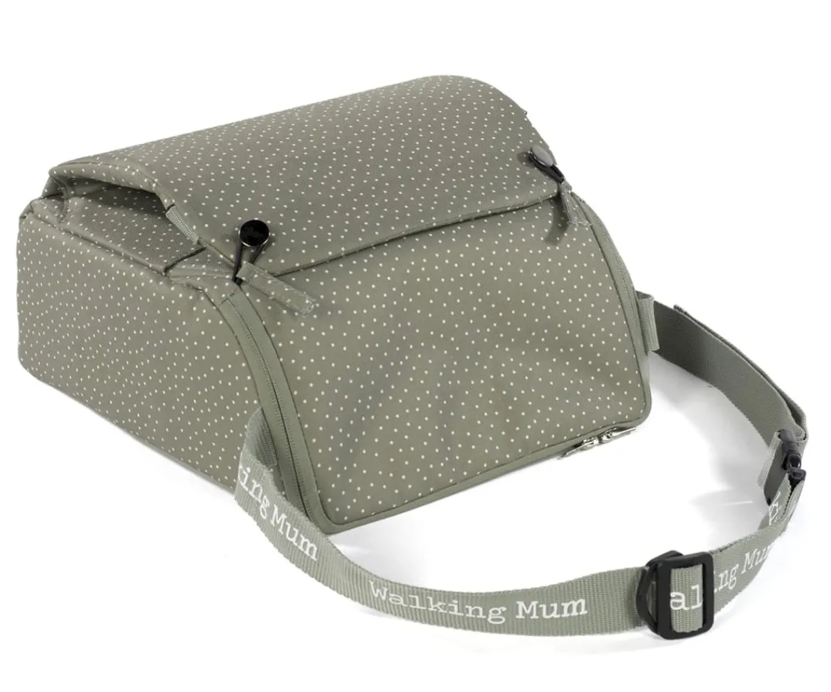 Trona portátil de la colección lunares Poppy Musgo de Walking Mum con función 2 en 1: asiento elevador y bolsa de almacenaje con asa para colgar del hombro.