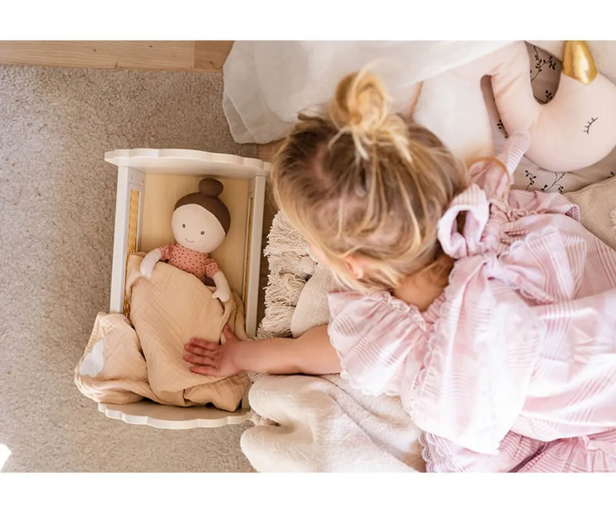 Preciosa cuna de madera en color blanca con detalles decorativos de ratán para arropar a tus muñecos y llevarlos al país de los sueños.