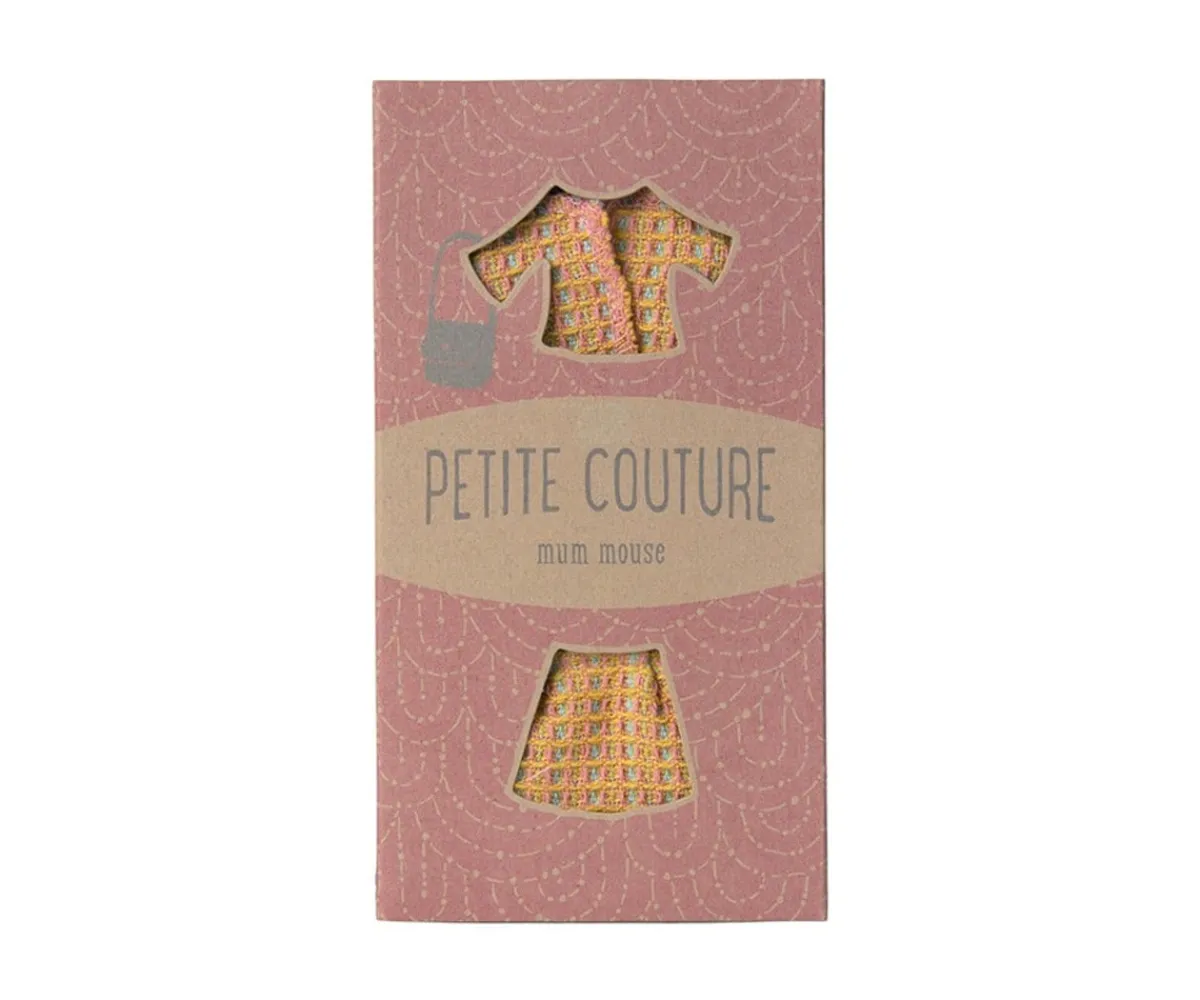 Un conjunto de ropa ideal para el ratón tamaño Mamá de Maileg. Está formado por una chaqueta corta, una falda y un bonito bolso a juego.
