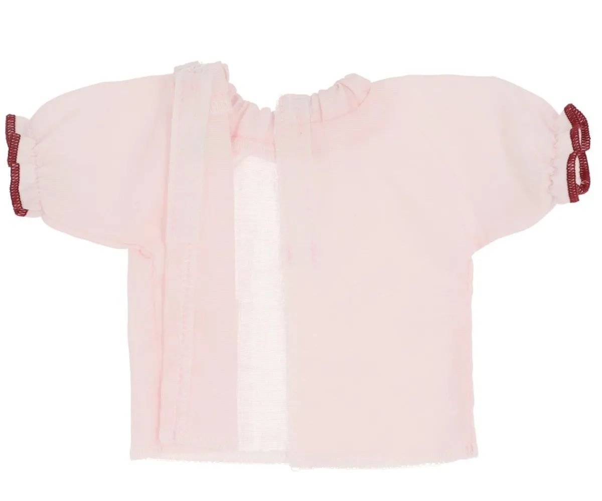 Blusa de popelín color rosa pastel, perfecta para tus primeros muñecos Soft o los muñecos Oli de la marca Así. Fabricado en tela popelín con detalle de volantitos en sus mangas y ribete en color granate, esta blusa quedará ideal para cualquier look.