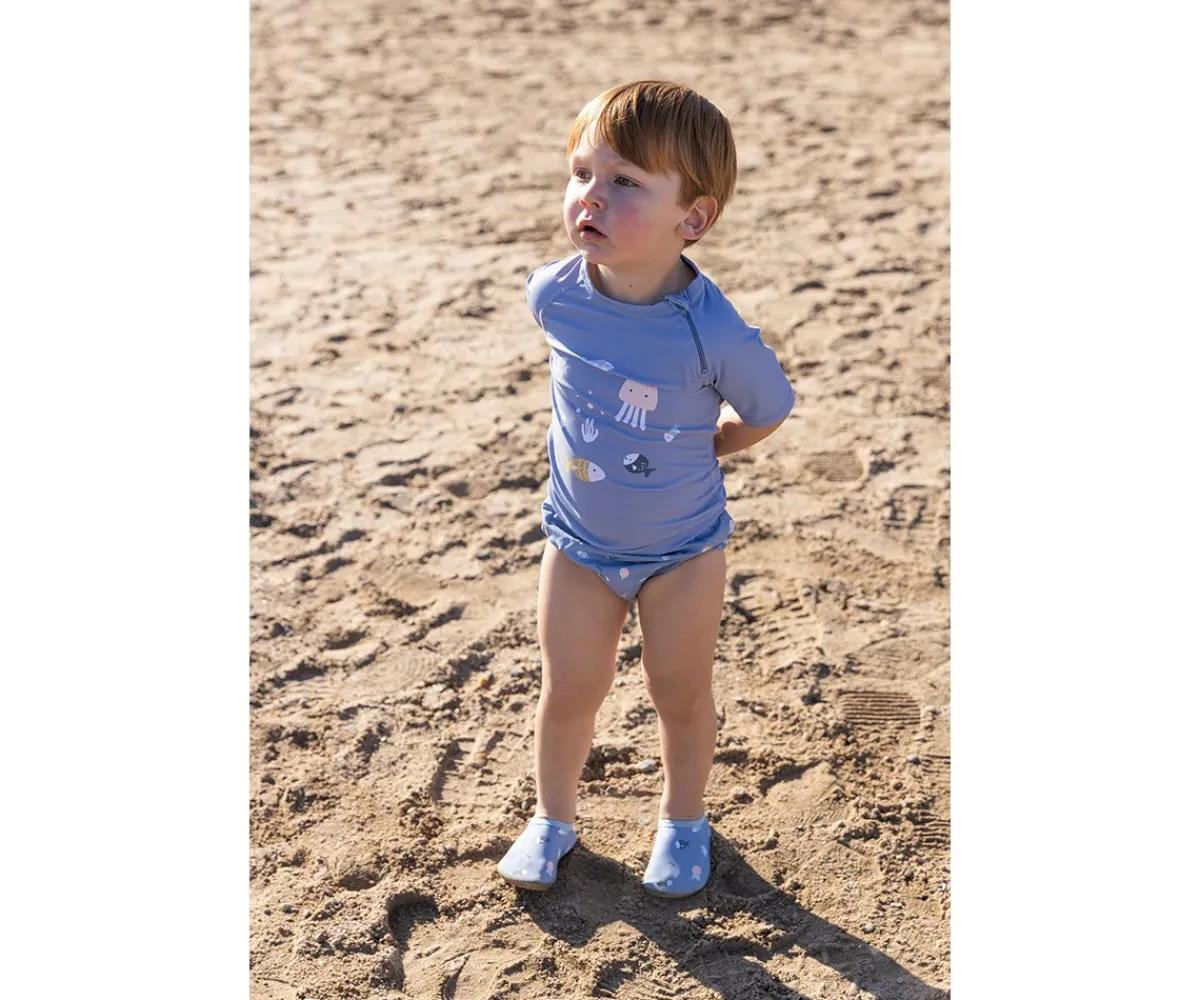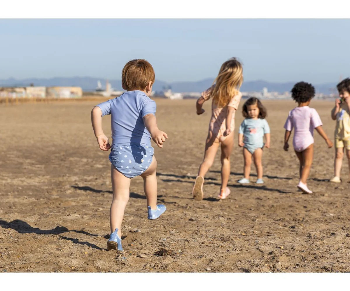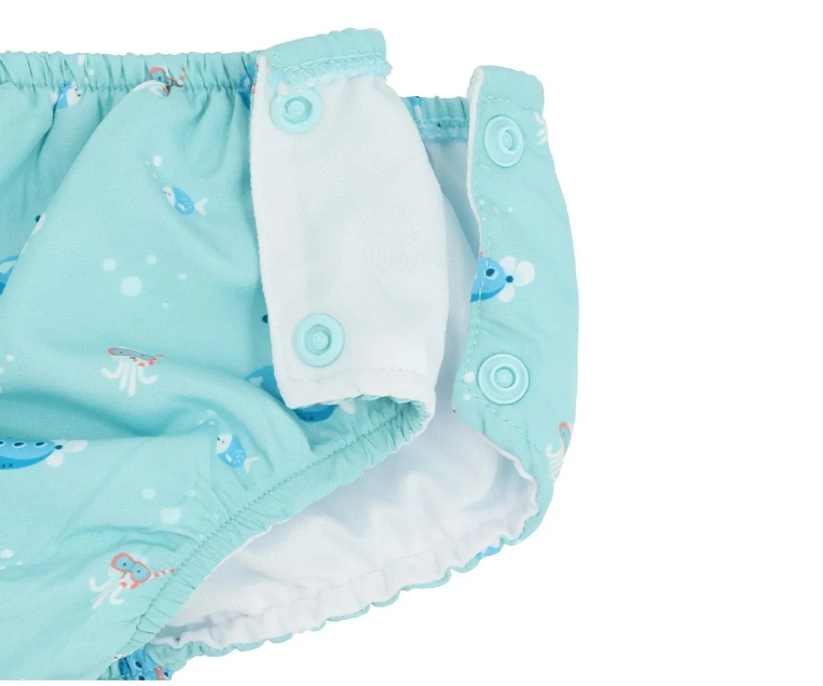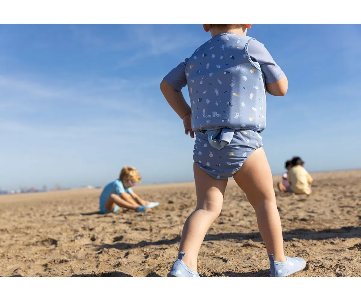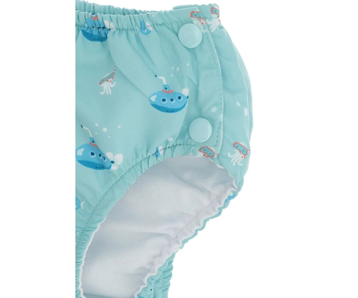 Bañador pañal de la colección Submarine de Monnëka que ha sido creado con una tela especial que protege a la piel de los rayos solares además que evita fugas sólidas cuando el peque se está bañañdo en la playa o la piscina.