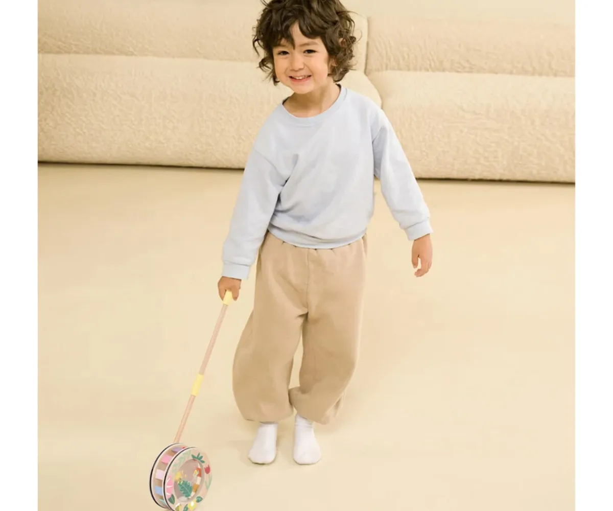 Los peques que comienzan a dar sus primeros pasos estarán encantados de arrastrar por todos los rincones de casa el original juguete de arrastre con rueda de arco iris. Esta rueda tiene una bolita en su interior que al girarla emite un sonido muy divertido.