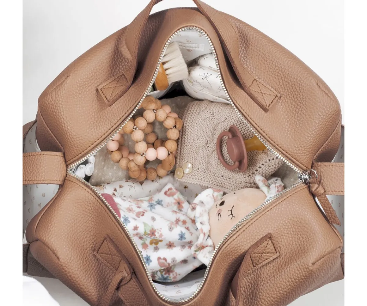 Confeccionada con ecopiel, esta bolsa ofrece una gran capacidad para llevar todos los artículos esenciales de tu bebé cuando estás fuera de casa. Su diseño versátil incluye cortas de mano y asa larga para llevar al hombro o en el cochecito.