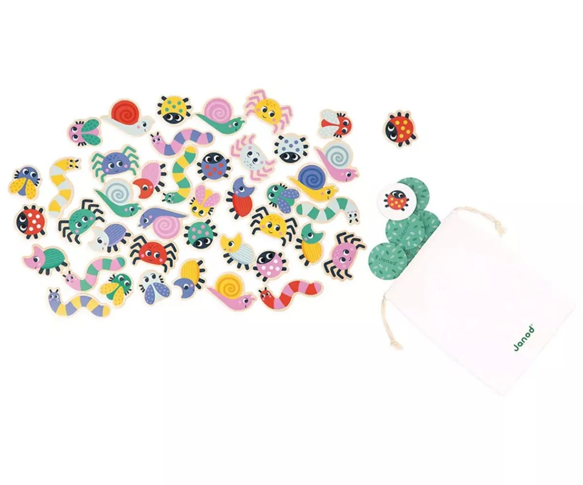 - Incluye: 42 insectos de madera (7 orugas, 7 mariquitas, 7 caracoles, 7 escarabajos, 7 arañas y 7 moscas), 42 cartas redondas de cartón y 1 bolsa de algodón para guardar y llevar contigo
