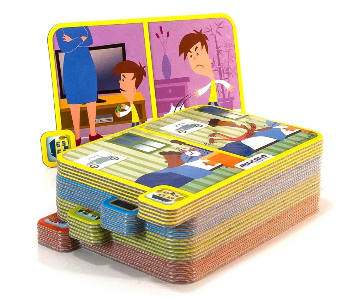 Descubre cómo gestionar las emociones con este juego de mesa de Miniland. A través de tarjetas que ocultan acciones diarias que generan enfado o tristeza, los jugadores se convierten en detectives para proponer soluciones que conduzcan a emociones positivas.