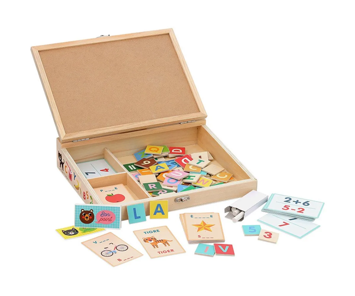 - Incluye: 2 tizas, 50 cartas con vocabulario, 30 cartas de operaciones, 70 letras de madera, 12 tarjetas de buen trabajo