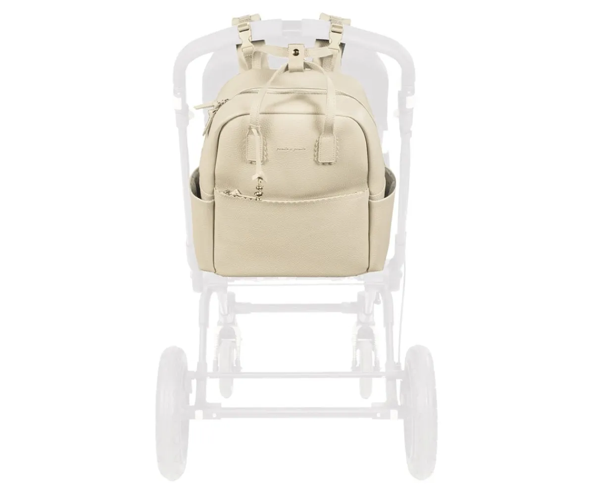 Mochila Icon Cream de Pasito a Pasito, es ideal para llevar todo lo necesario durante el paseo del bebé. Su resistente y delicada polipiel lo hace ligero y duradero, con amplio compartimento principal espacioso, bolsillo interior térmico para biberones, bolsillo plastificado y bolsillo para cambiador.