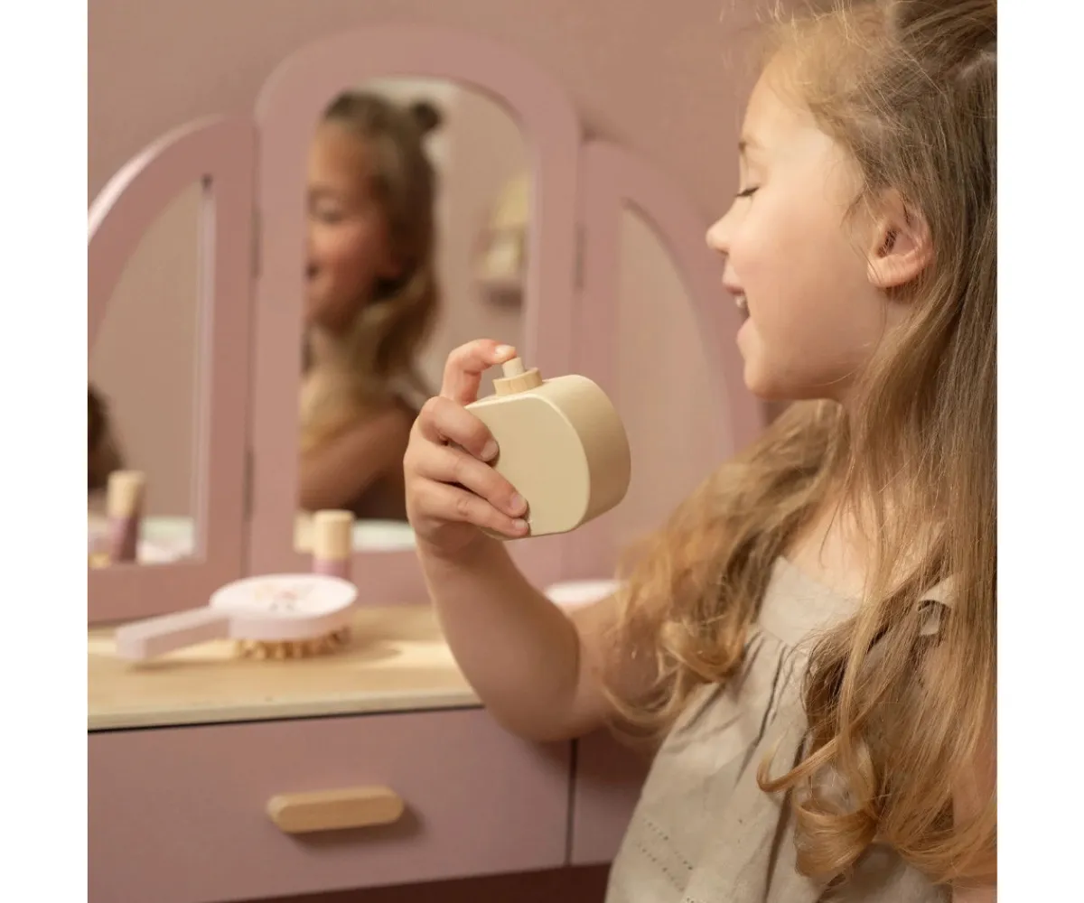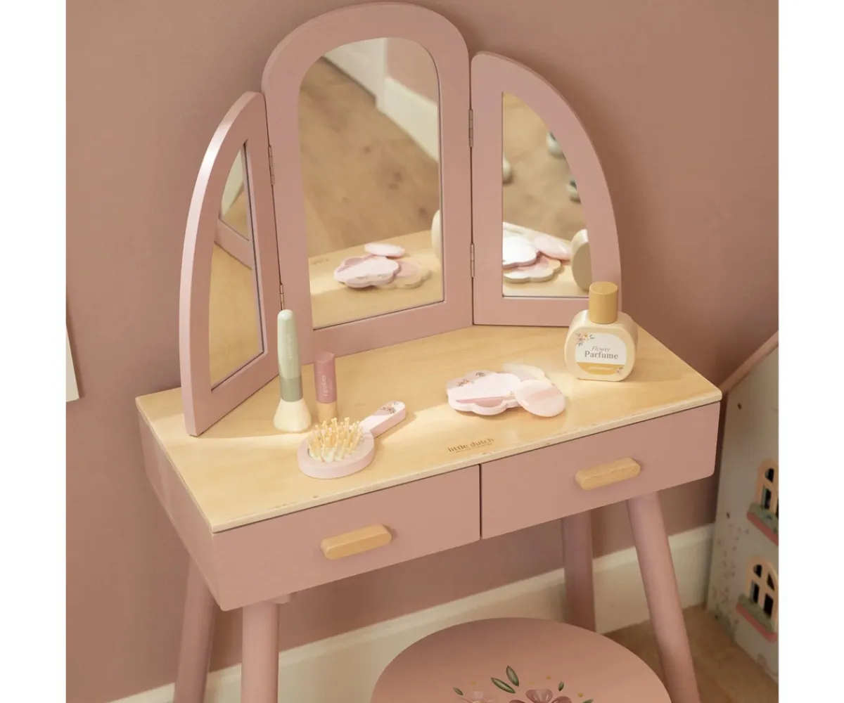 El tocador cuenta con un elegante espejo de tres paneles, perfecto para verse desde todos los ángulos, y amplios cajones donde guardar accesorios, joyitas y sus pequeños tesoros. Incluye seis productos de belleza de madera y un taburete a juego adornado con una delicada ilustración floral, que completa el conjunto y crea un rincón mágico en la habitación infantil.