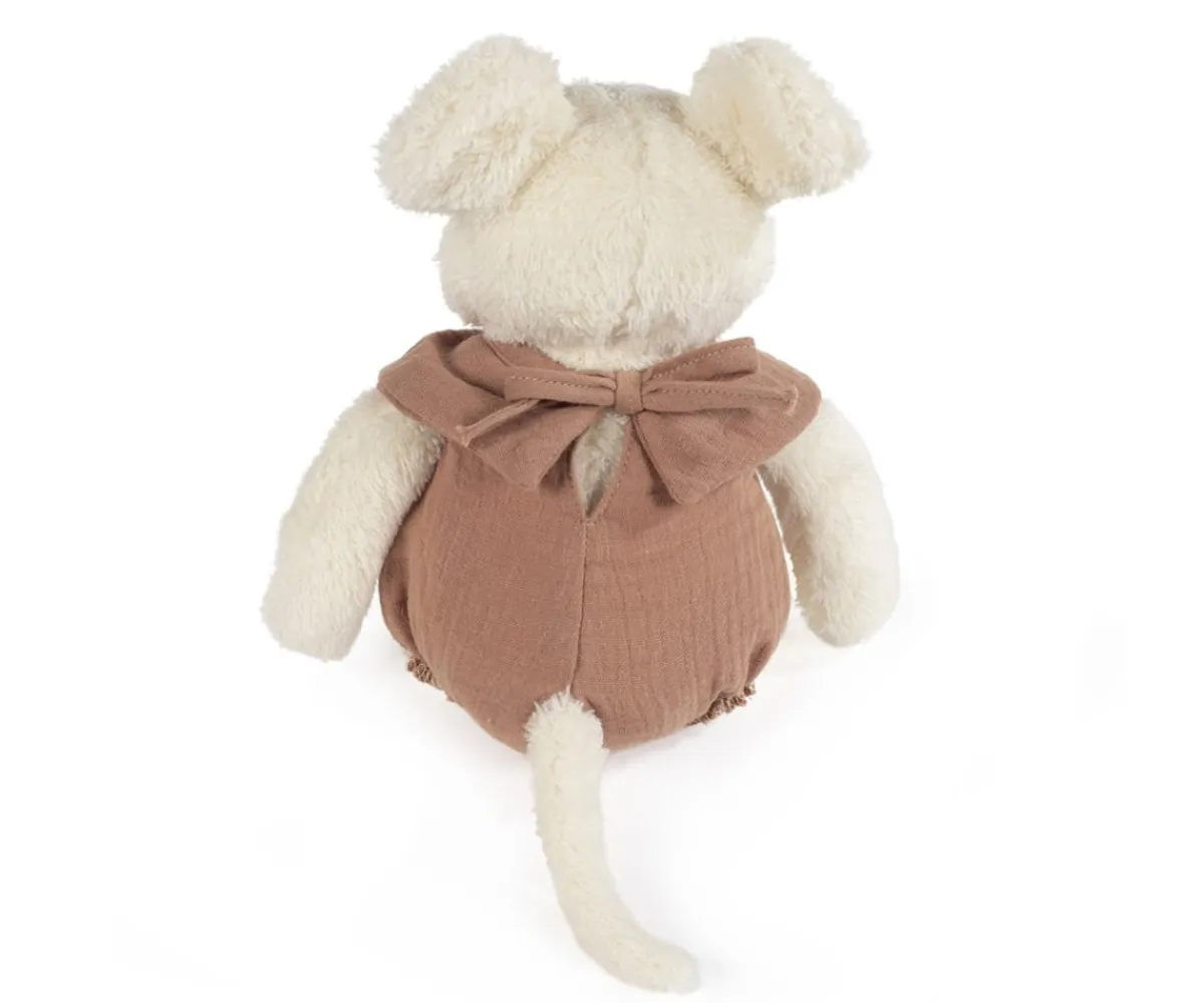 Ratón de peluche con una medida de 25 cm, con un bonito peto color canela, muy suave y con una textura muy agradable. Sus ojos, nariz y boca están bordados garantizando la seguridad de tu bebé.