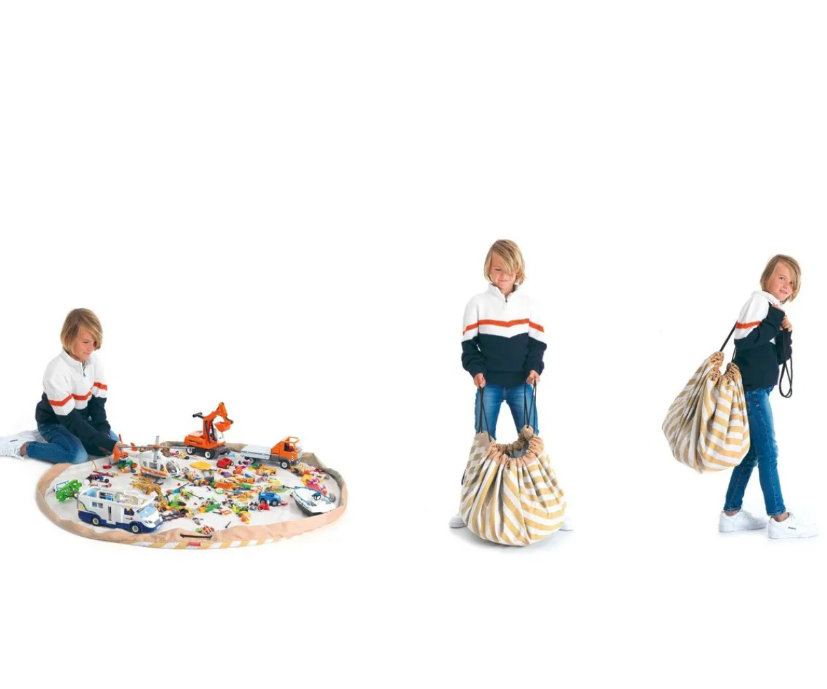 Este saco se desdobla y se convierte en una manta de juegos donde el niño puede jugar con todas sus juguetes, grandes y pequeños, y cuando llega la hora de acostarse, sólo hay que cerrarla y ya está todo recogido.
