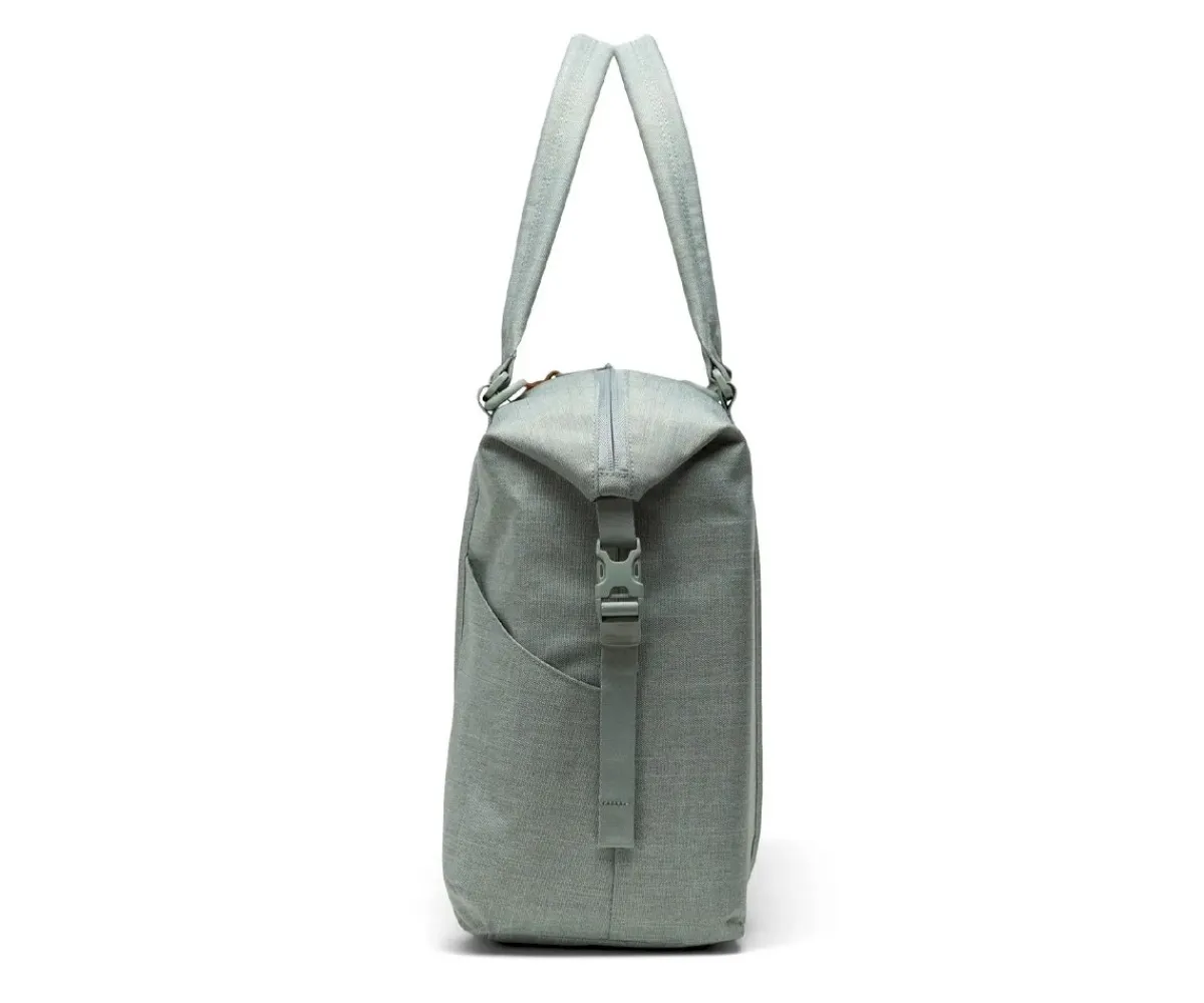 Es estupenda para llevar al hombro o en la mano gracias a sus asas cortas reforzadas, y muy cómoda para colocar en el carrito de tu bebé gracias a sus cierres de clip.