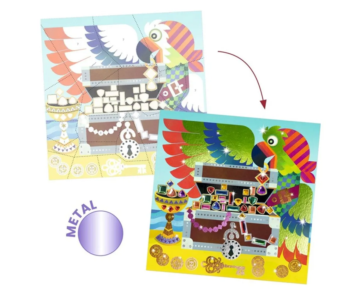 4 cuadros ilutrados prepegados con temática de piratas que tendrás que revelar mediante una herramienta de plástico, un surtido de láminas de colores texturizadas para pegar y pegatinas de pedrería para decorar.