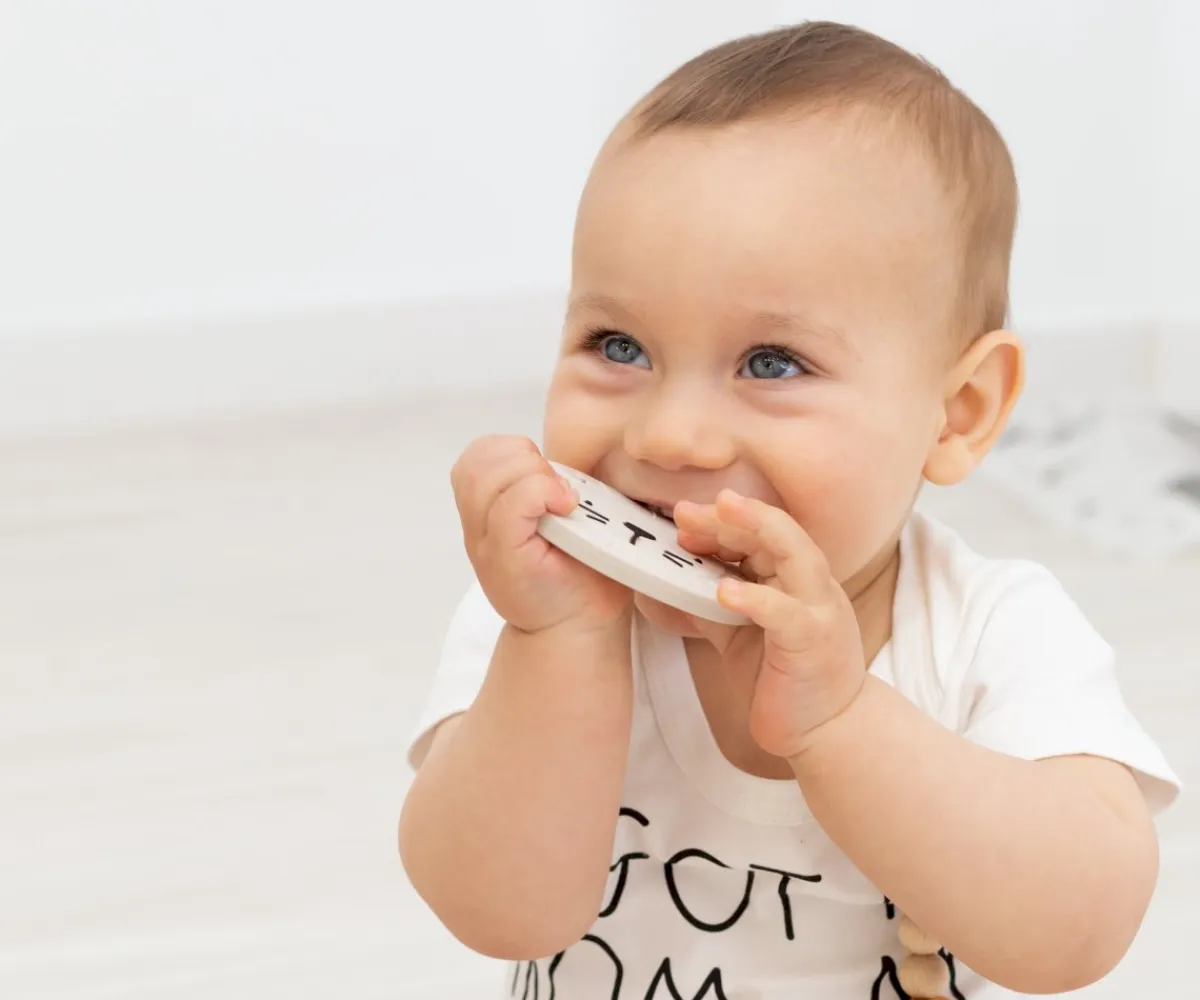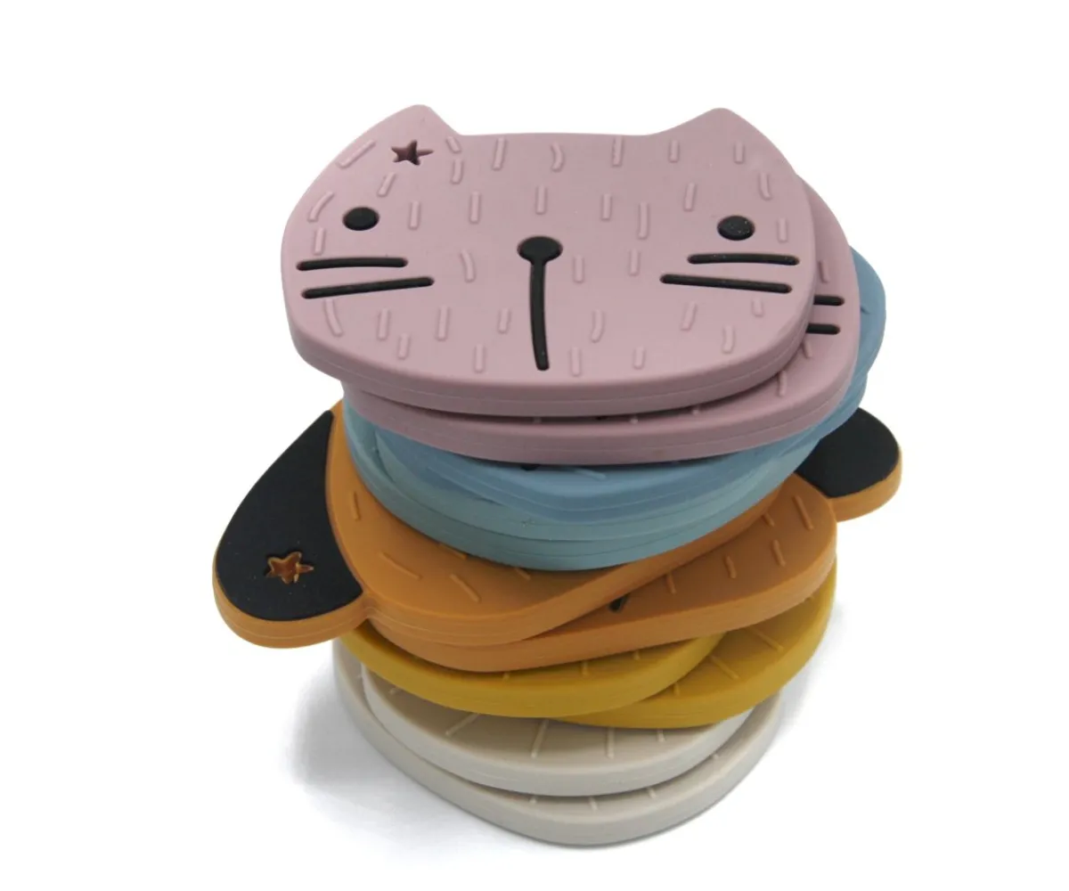 Mordedor fabricado en silicona con pequeñas protuberancias para aliviar las encías doloridas.