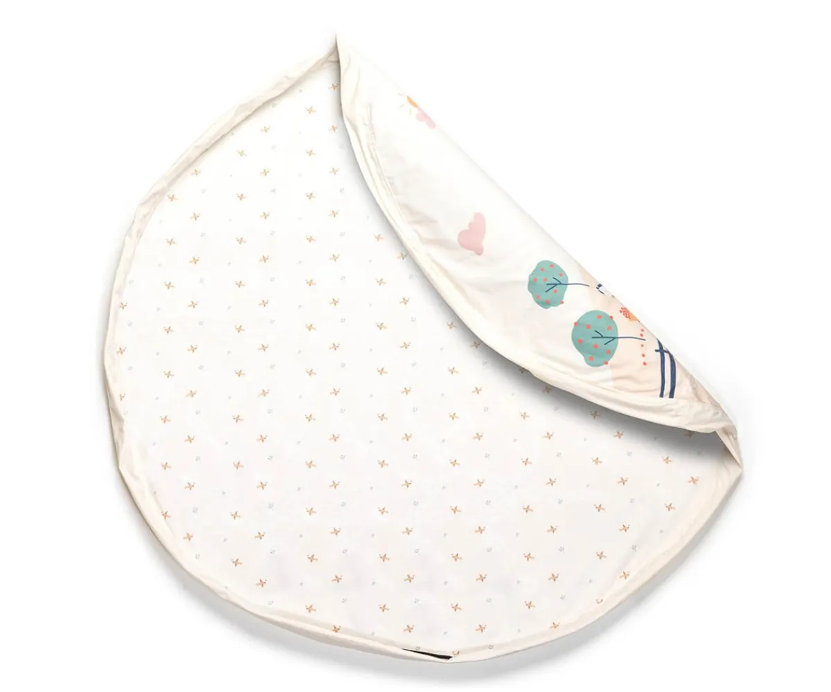 Este saco se desdobla y se convierte en una manta de juegos donde el niño puede jugar con todas sus juguetes, grandes y pequeños, y cuando llega la hora de acostarse, sólo hay que cerrarla y ya está todo recogido.