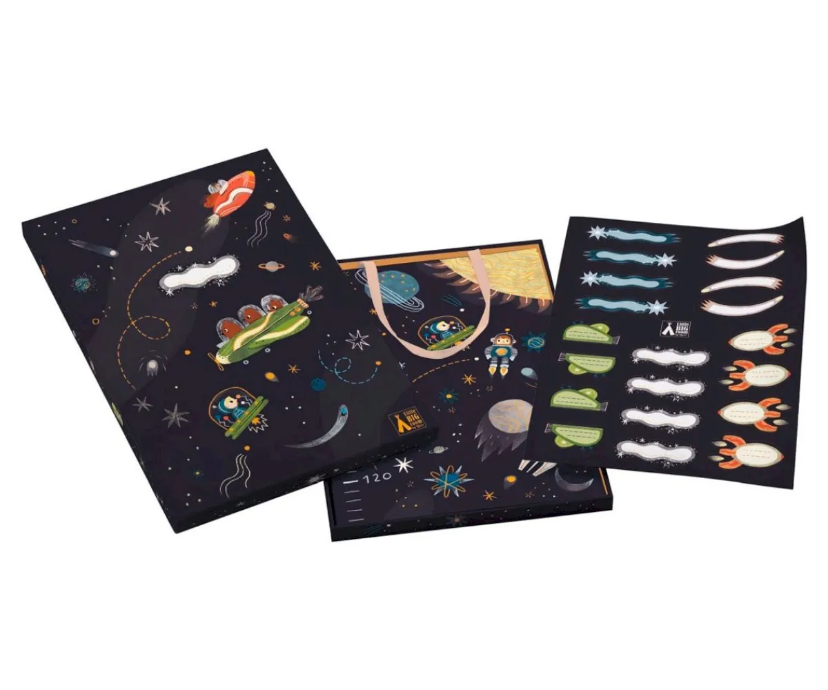 Original medidor de pared con numerosos adhesivos posicionales de temas espaciales.