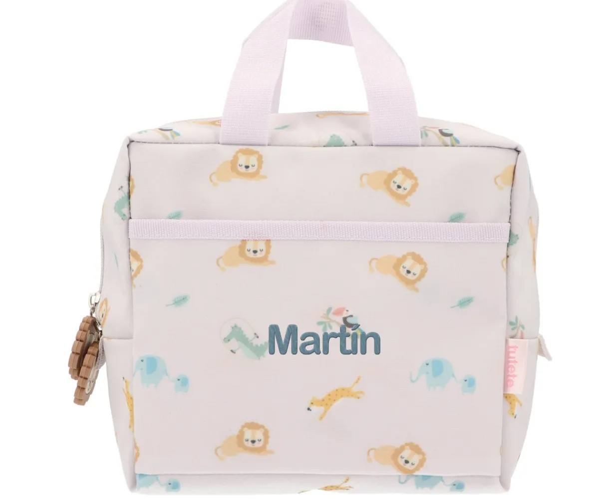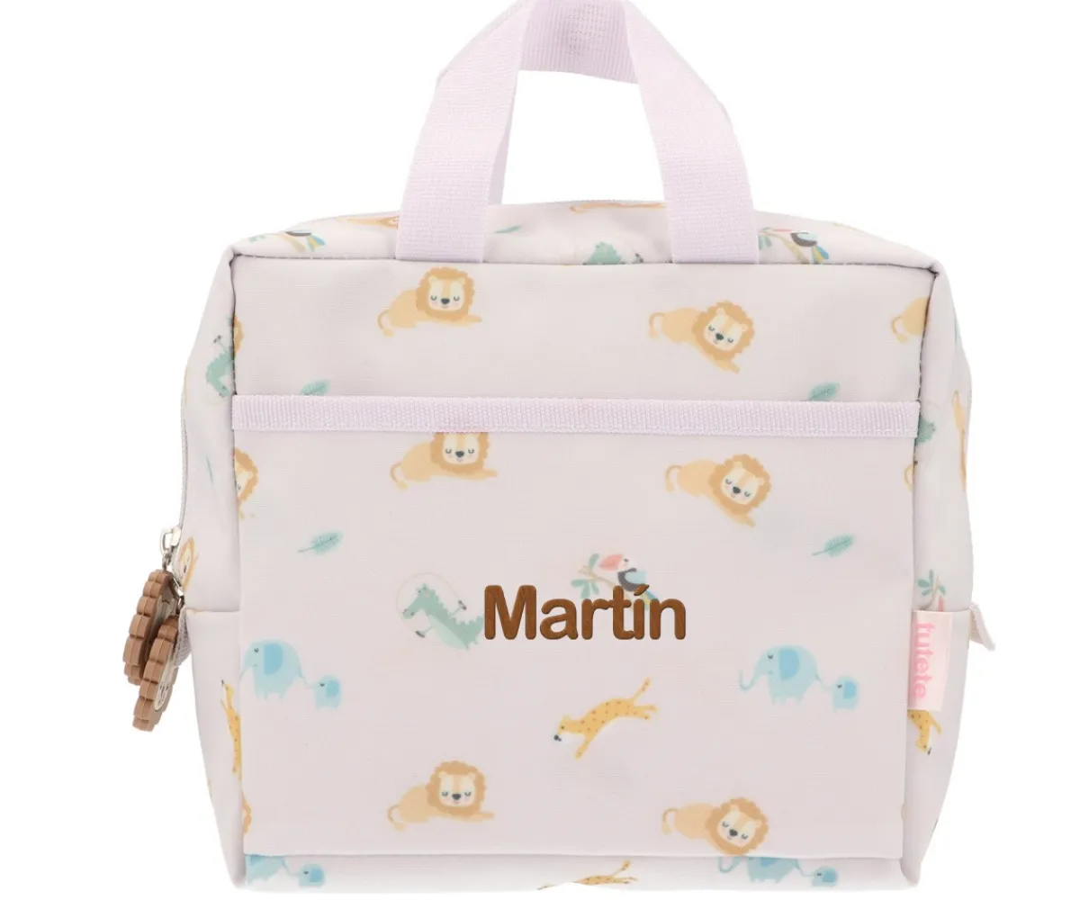 Tiene 2 asas cortas, para fácil transporte, y un bolsillito exterior donde puedes guardar cubiertos o pequeños objetos que necesites tener más a mano, que se puede personalizar con el nombre.