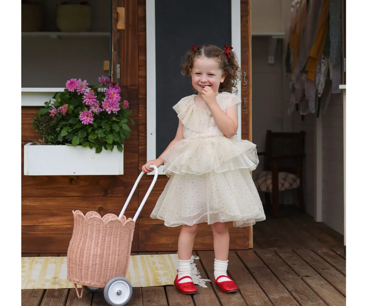 El complemento perfecto para acompañar a tu peque en sus pequeñas aventuras.Con su encantador diseño en forma de pétalos y su color suave y delicado, este carrito de mimbre aporta un toque mágico a cada paseo, ya sea en el jardín, la playa o de camino al mercado.