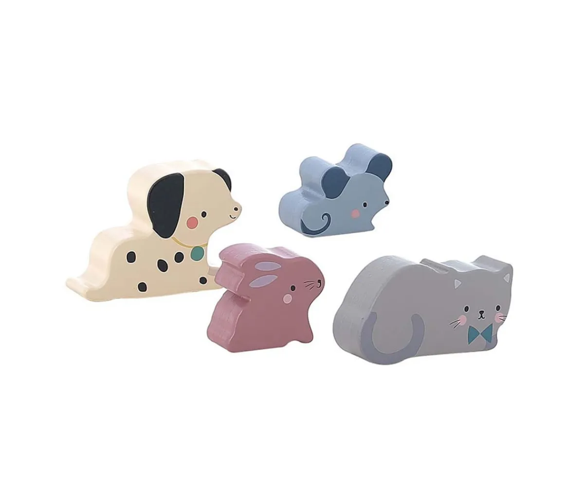 - Contenido: 1 casita de madera con formas + 4 animales: perro, conejo, gato, ratón