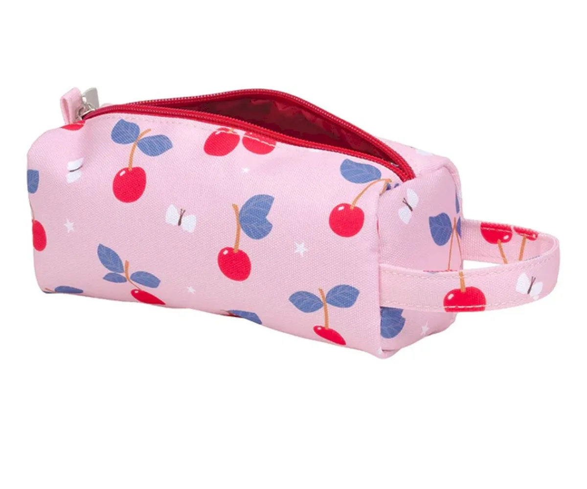 Precioso estuche escolar con dulce estampado de cerezas para que los peques lleven todos sus lápices y material que necesiten en un solo lugar. Está forrado por dentro, cuenta con cierre de cremallera y un asa lateral para que lo puedas transportar fácilmente.