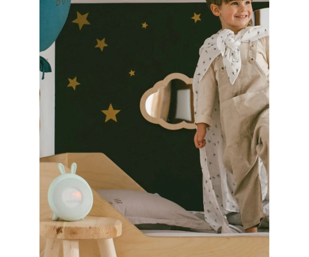 El reloj despertador con forma de conejito de Rabbit&Friends acompañará a los peques cada mañana en su despertar. Muestra la hora, es despertador y lámapara, cuya intensidad y color de luz puede cambiar.